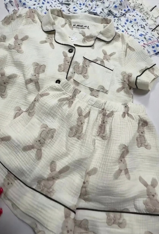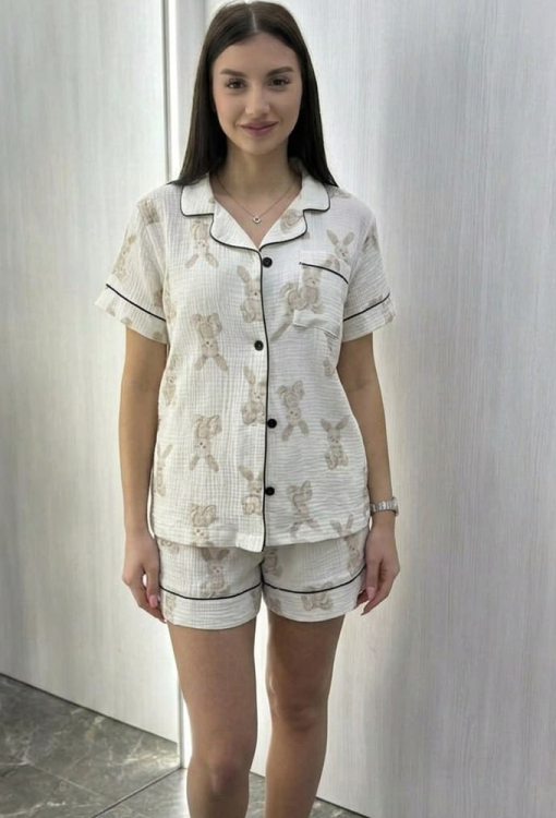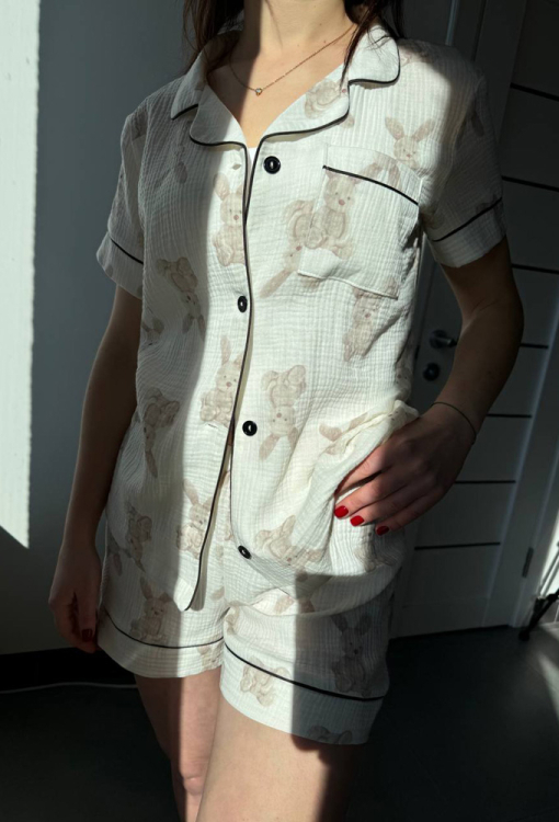 Летняя женская пижама от украинского бренда BO.Brand. Пижама выполнена из качественного и мягкого двухслойного муслина, белого цвета в принт из серых кроликов, состоит из рубашки и шорт прямого силуэта. Рубашка с короткими рукавами и отложным воротником, застегивается на пуговицы, на груди слева украшена маленьким карманчиком. Воротник, полки, рукава и карман украшены тонким кантом черного цвета. Шорты с удобной посадкой и мягкой резинкой в поясе, украшены контрастным кантом внизу. Пижама красивая и очень комфортная, идеальна для сна и домашнего отдыха, а также может быть замечательным подарком любимому и близкому человеку.