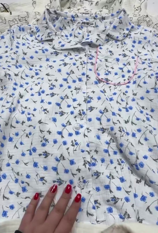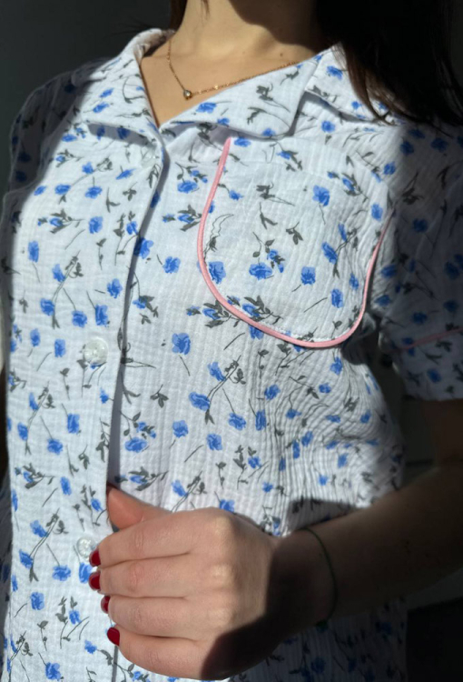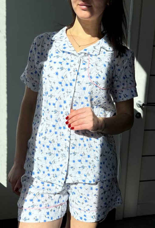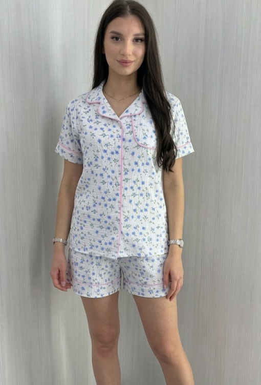 Нежная женская пижама от украинского бренда BO.Brand. Пижама выполнена из качественного и мягкого двухслойного муслина, белого цвета в голубой цветочный принт, состоит из рубашки и шорт прямого силуэта. Рубашка с короткими рукавами и отложным воротником, застегивается на пуговицы, на груди слева украшена маленьким карманчиком. Воротник, полки, рукава и карман украшены тонким кантом розового цвета. Шорты с удобной посадкой и мягкой резинкой в поясе, украшены контрастным кантом внизу и бантиком на талии. Пижама красивая и очень комфортная, идеальна для сна и домашнего отдыха, а также может быть замечательным подарком любимому и близкому человеку.