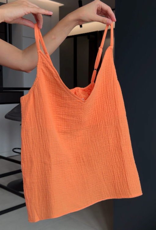 Яркая женская пижама от украинского бренда DaLi. Пижама выполнена из качественного и мягкого муслина, состоит из майки оранжевого цвета и белых шорт в мелкие цветочки желтого цвета. Майка прямого силуэта, на тонких регулируемых бретелях и с V-образным декольте. Шорты с удобной посадкой, мягкой резинкой в поясе и удобными боковыми карманами. Пижама очень красивая и комфортная, идеальна для жарких летних ночей, а также может быть замечательным подарком любимому и близкому человеку.