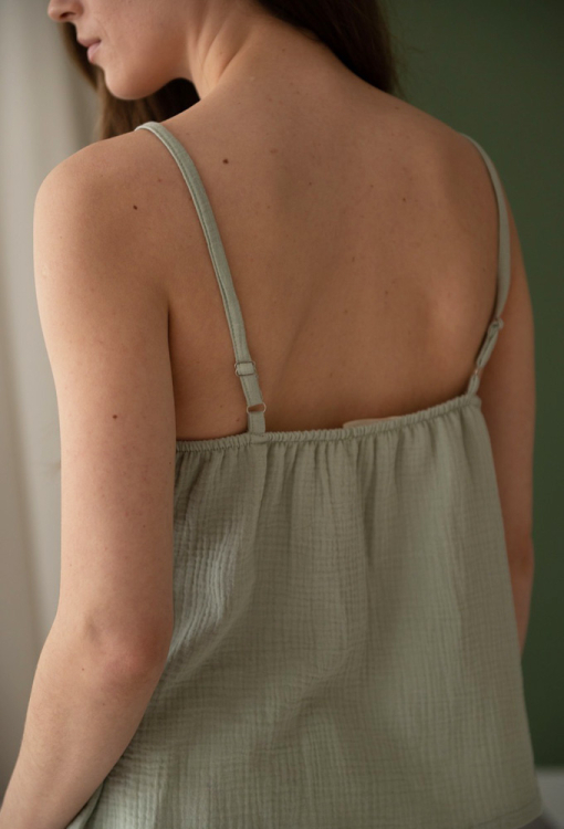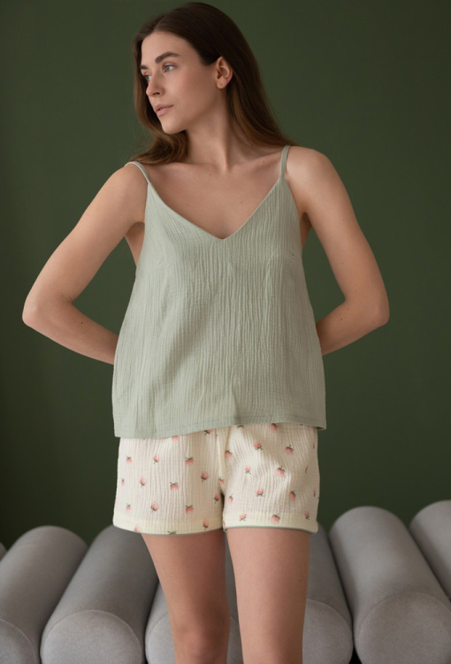Легкая женская пижама от украинского бренда LoomLine. Пижама выполнена из качественного и мягкого двухслойного муслина, состоит из майки серого цвета и молочных шорт с принтом в виде маленьких розочек. Майка свободного кроя, на тонких регулируемых бретелях и с V-образным вырезом горла, шорты прямые и с мягкой резинкой в поясе. Пижама красивая и очень комфортная, идеальна для сна и домашнего уюта, а также может быть замечательным подарком любимому и близкому человеку.