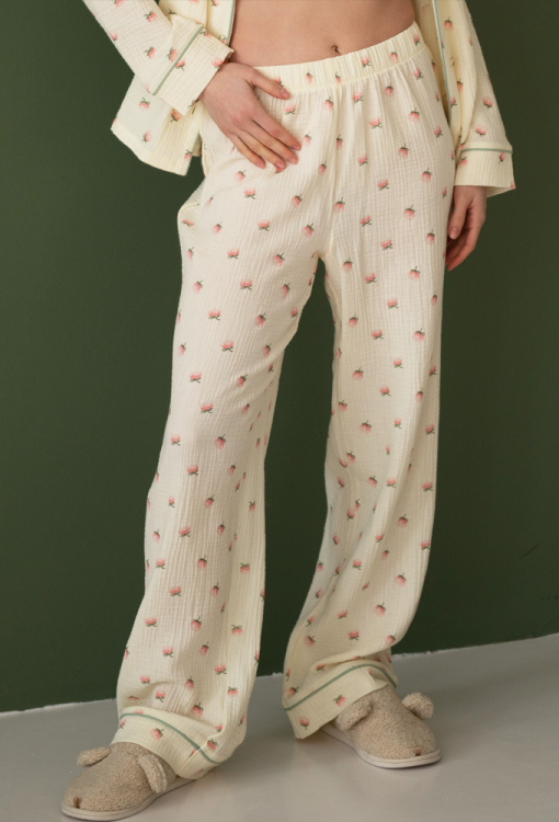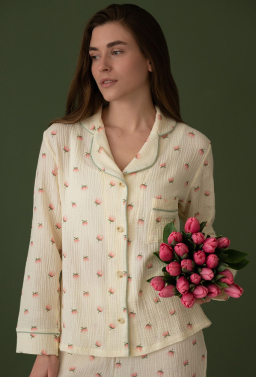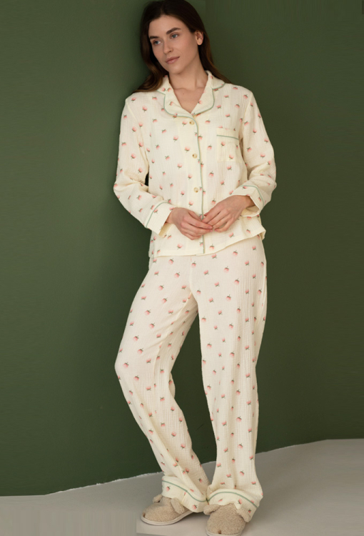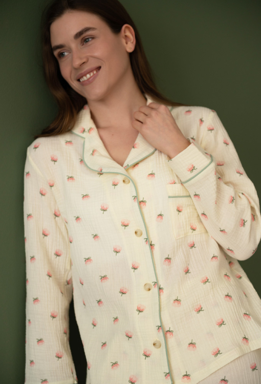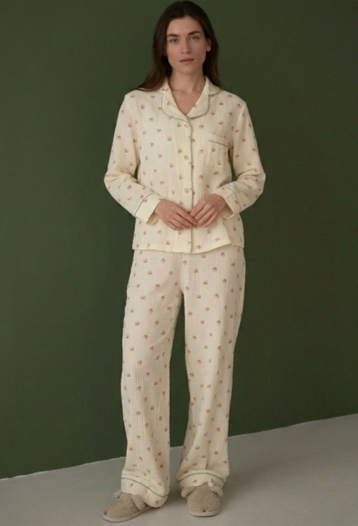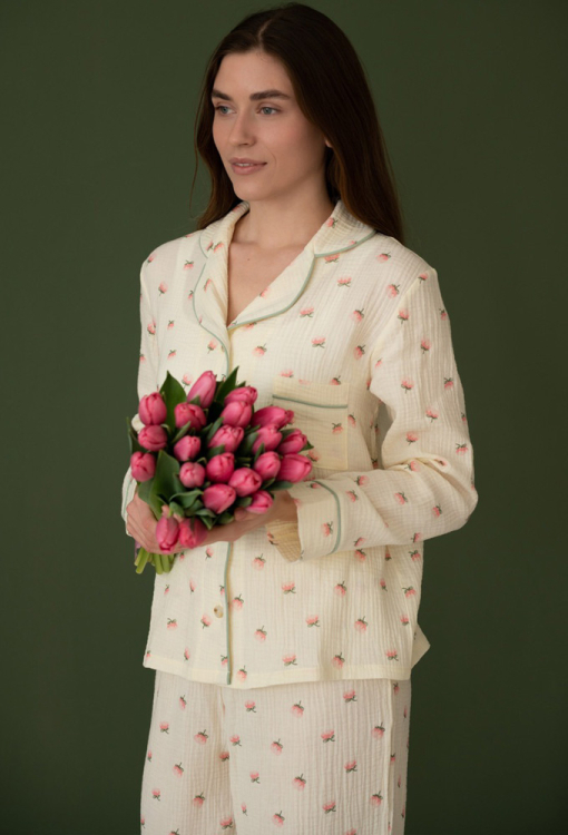 Красивая женская пижама от украинского бренда LoomLine. Пижама выполнена из качественного и мягкого двухслойного муслина, бежевого цвета с принтом в виде маленьких розовых розочек с зелеными листьями, состоит из рубашки классического силуэта и штанов свободного кроя. Рубашка с длинными рукавами, отложным воротником и маленьким нагрудным карманчиком, застегивается на пуговицы, воротник, полки, карман и рукава модели украшены тонким кантом зеленого цвета. Штаны с удобной посадкой и мягкой резинкой в поясе внизу также обработаны зеленым кантом. Пижама стильная и очень комфортная, идеальна для сна и домашнего уюта, а также может быть замечательным подарком любимому и близкому человеку.