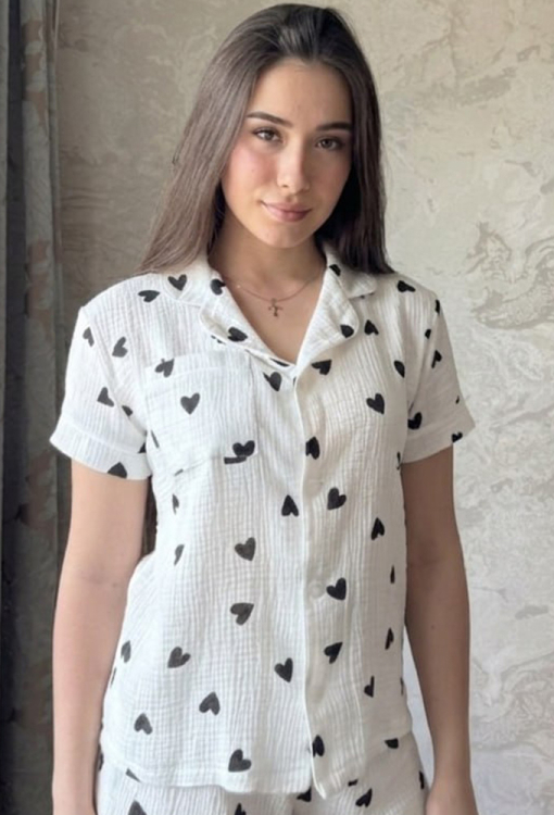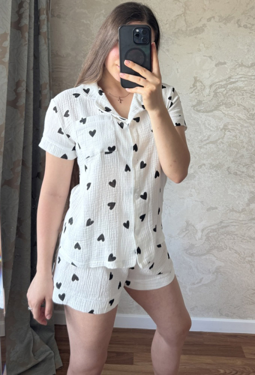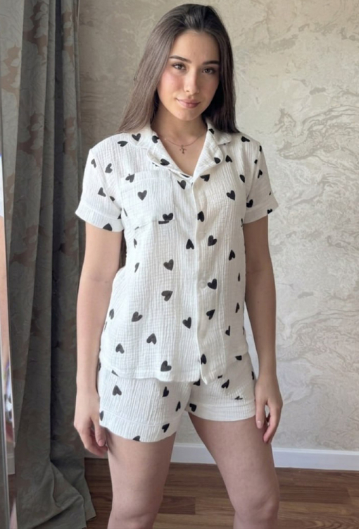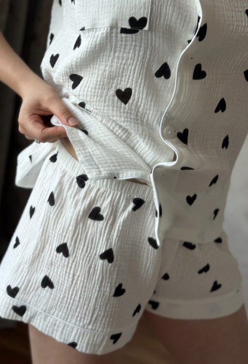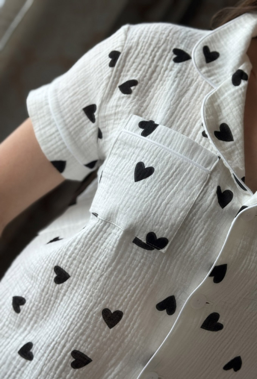 Летняя женская пижама от украинского бренда Marinella. Пижама выполнена из качественного и приятного к телу муслина, белого цвета в принт черные сердечка, состоит из рубашки и шорт прямого силуэта. Рубашка с короткими рукавами и отложным воротником, застегивается на пуговицы. На груди слева модель обработана маленьким накладным карманчиком, воротник, полки, рукава и карман модели украшены тонким кантом белого цвета. Шорты с мягкой резинкой в поясе, внизу оформлены свободными манжетами и украшены тонким белым кантом. Пижама станет отличным выбором для тех, кто ценит комфорт, стиль и качество!