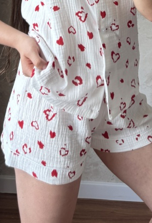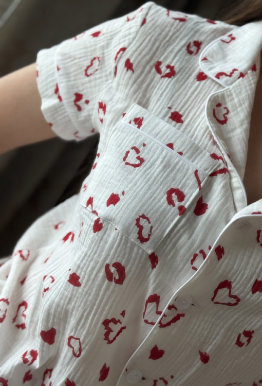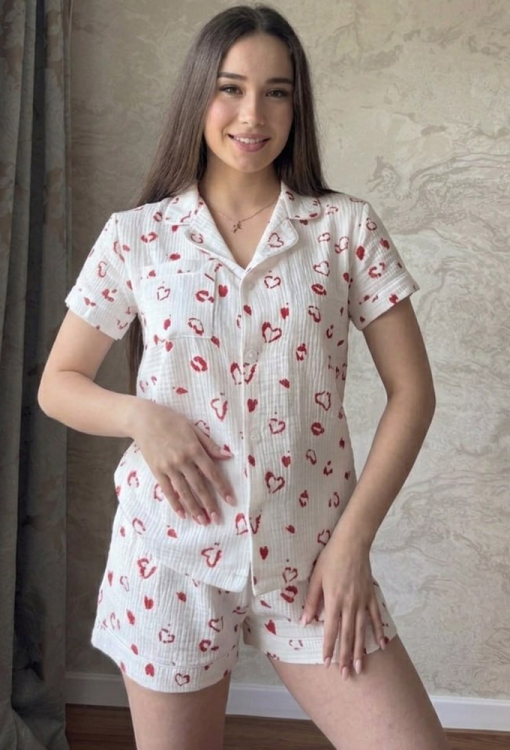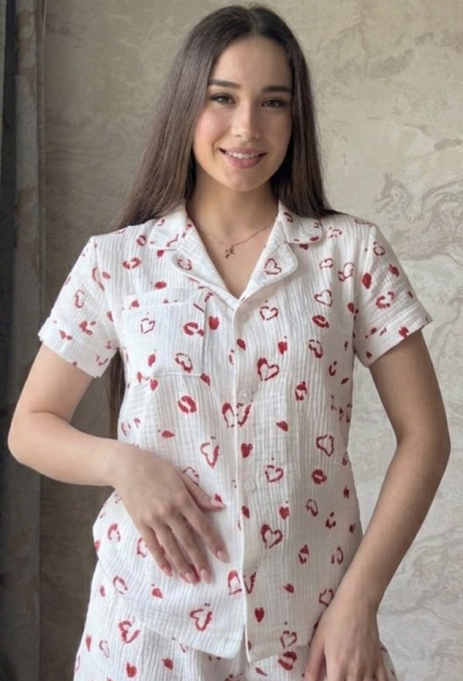 Романтичная женская пижама от украинского бренда Marinella. Пижама выполнена из качественного и приятного к телу муслина, белого цвета в принт сердечка с красным контуром, состоит из рубашки и шорт прямого силуэта. Рубашка с короткими рукавами и отложным воротником, застегивается на пуговицы. На груди слева модель обработана маленьким накладным карманчиком, воротник, полки, рукава и карман модели украшены тонким кантом белого цвета. Шорты с мягкой резинкой в поясе, внизу оформлены свободными манжетами и украшены тонким белым кантом. Пижама станет отличным выбором для тех, кто ценит комфорт, стиль и качество!