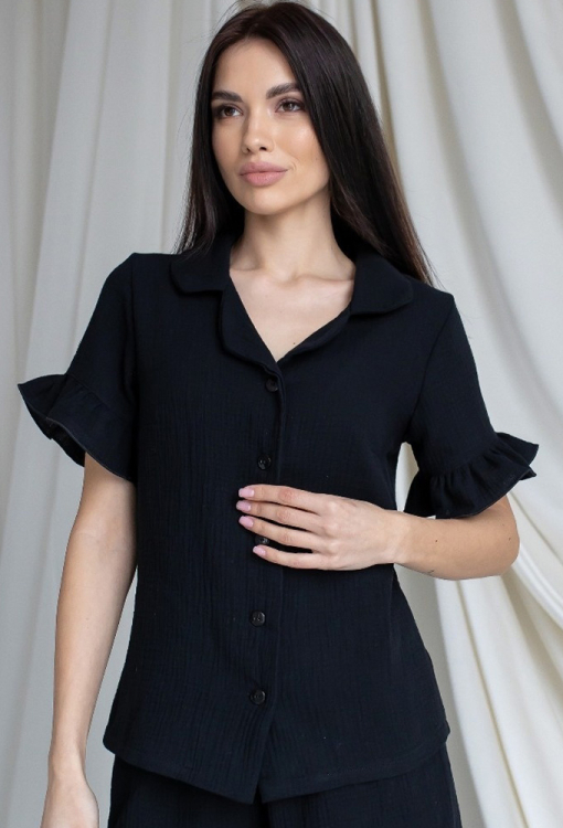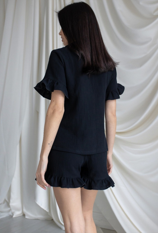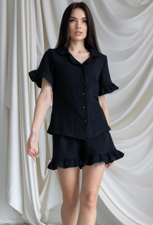 Трендовая женская пижама от украинского бренда MiaNaGreen. Пижама выполнена из мягкого и качественного муслина черного цвета, состоит из рубашки и шорт прямого силуэта. Рубашка с короткими рукавами и и отложным воротником, застегивается на пуговицы, рукава обработаны рюшами. Шорты с удобной посадкой и мягкой резинкой в поясе, внизу украшены рюшами. Пижама очень красивая и комфортная, идеальна для сна и домашнего отдыха, а также может быть отличным подарком любимому или близкому человеку.