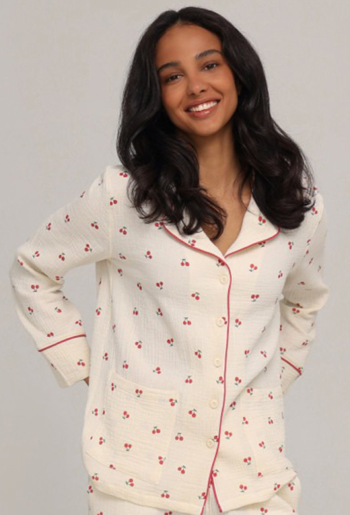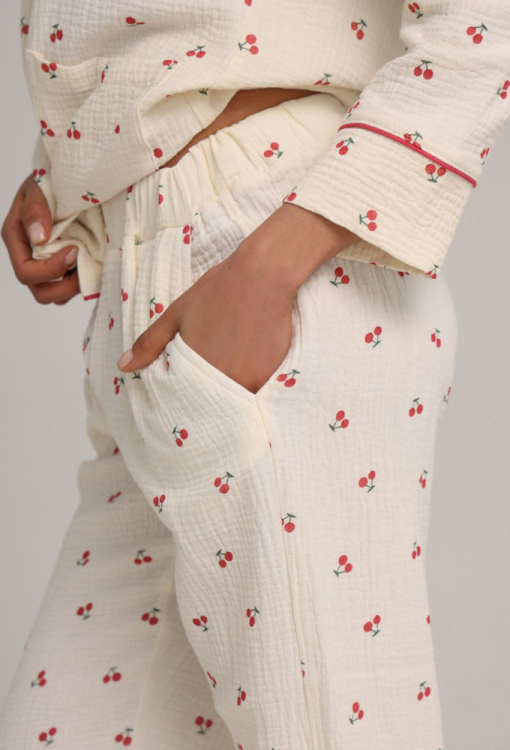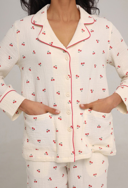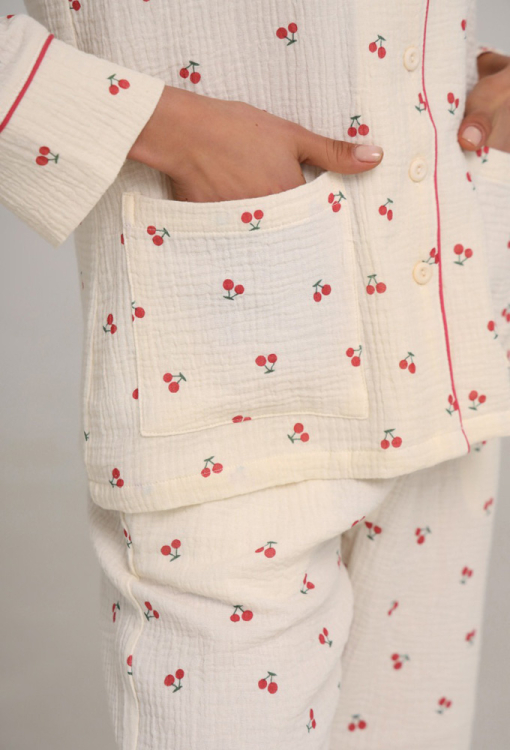Легкая женская пижама из коллекции My Cherry от украинского бренда German Volf. Пижама выполнена из качественного и мягкого муслина, кремового цвета с принтом красных вишен, состоит из рубашки и штанов прямого силуэта. Рубашка с длинными рукавами и отложным воротником, застегивается на пуговицы, воротник, полки и рукава модели украшены тонким кантом красного цвета, по бокам расположены два накладных кармана. Штаны с мягкой резинкой в поясе и удобными боковыми карманами, украшены контрастным кантом по низу. Пижама очень красивая и комфортная, идеальна для сна, отдыха или вечерних посиделок, также может быть полезным подарком близким людям!