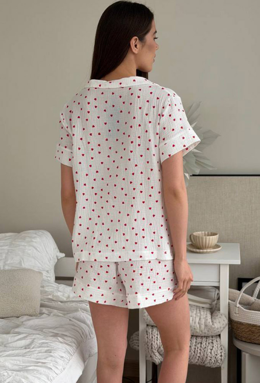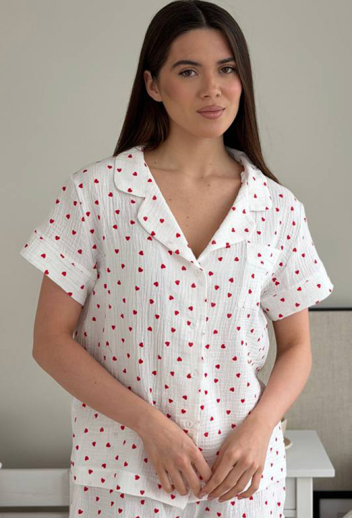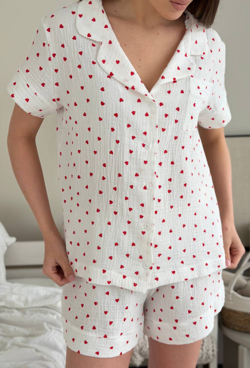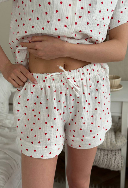 Романтичная женская пижама от украинского бренда V.Velika. Пижама выполнена из мягкого и качественного муслина, белого цвета с принтом в виде красных сердечек, состоит из рубашки и шорт свободного силуэта. Рубашка с короткими рукавами и отложным воротником, застегивается на пуговицы, на груди слева украшена маленьким накладным карманчиком, рукава обработаны свободными манжетами. Шорты с мягкой резинкой в поясе и широкими манжетами, регулируются по ширине с помощью внутреннего шнурка. Пижама очень красивая и комфортная, подойдет в качестве домашней одежды, а также может быть отличным подарком любимому или близкому человеку.