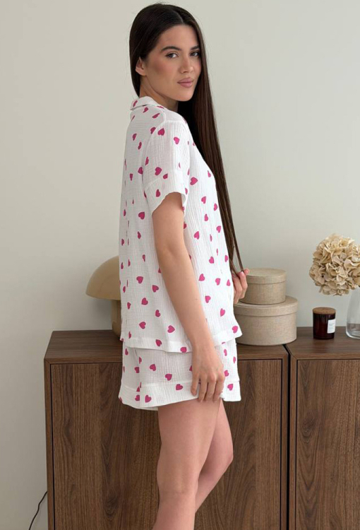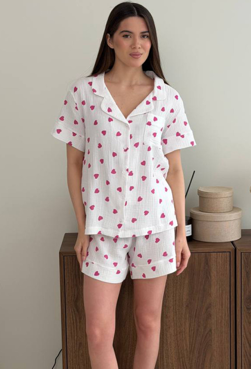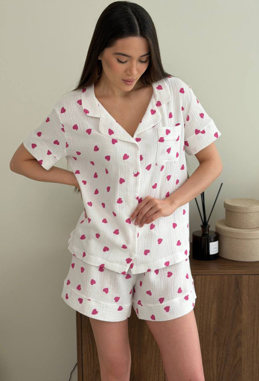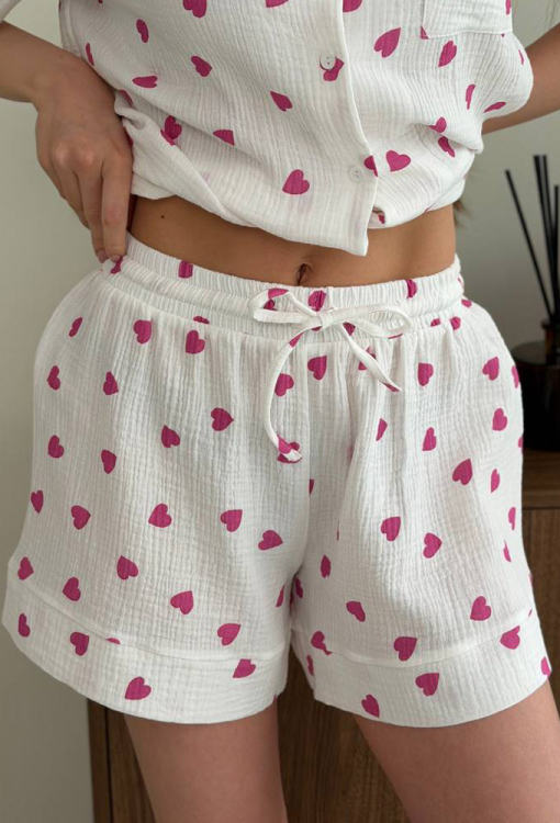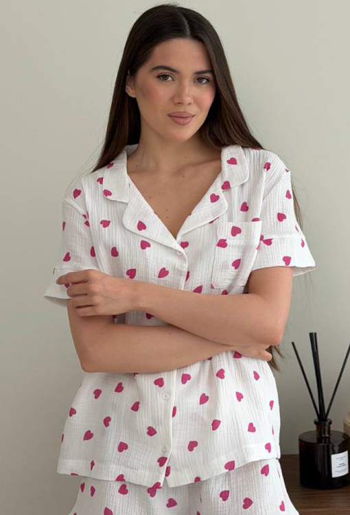 Романтичная женская пижама от украинского бренда V.Velika. Пижама выполнена из мягкого и качественного муслина, белого цвета с принтом в виде больших малиновых сердечек, состоит из рубашки и шорт свободного силуэта. Рубашка с короткими рукавами и отложным воротником, застегивается на пуговицы, на груди слева украшена маленьким накладным карманчиком, рукава обработаны свободными манжетами. Шорты с мягкой резинкой в поясе и широкими манжетами, регулируются по ширине с помощью внутреннего шнурка. Пижама очень красивая и комфортная, подойдет в качестве домашней одежды, а также может быть отличным подарком любимому или близкому человеку.