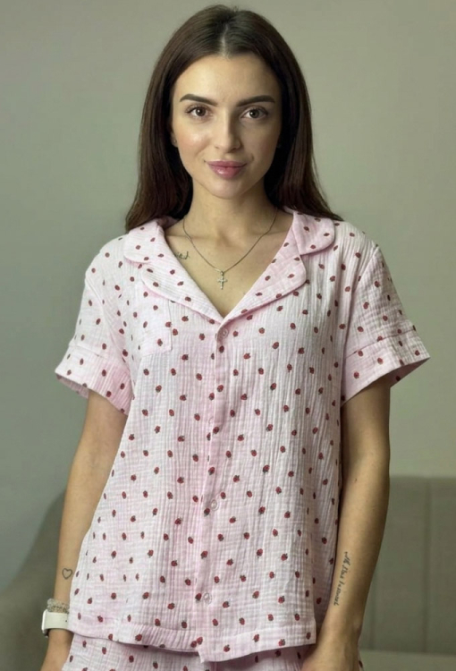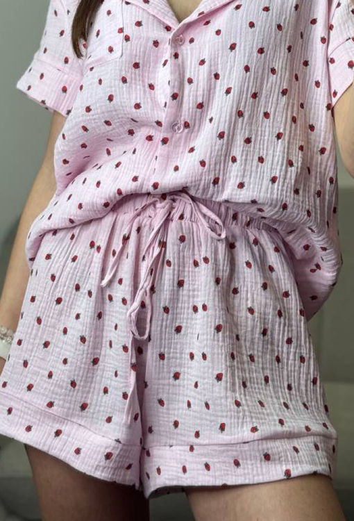 Легкая женская пижама от украинского бренда V.Velika. Пижама выполнена из мягкого и качественного муслина, розового цвета с принтом в виде маленьких земляничек красного цвета, состоит из рубашки и шорт свободного силуэта. Рубашка с короткими рукавами и отложным воротником, застегивается на пуговицы, на груди слева украшена маленьким накладным карманчиком, рукава обработаны свободными манжетами. Шорты с мягкой резинкой в поясе и широкими манжетами, регулируются по ширине с помощью внутреннего шнурка. Пижама очень красивая и комфортная, подойдет в качестве домашней одежды, а также может быть отличным подарком любимому или близкому человеку.
