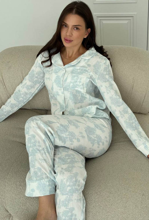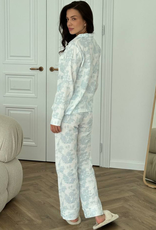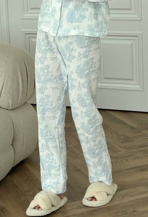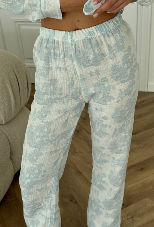 Легкая женская пижама от украинского бренда V.Velika. Пижама выполнена из мягкого и качественного муслина, белого цвета с голубым принтом в виде африканских растений и животных, состоит из рубашки и штанов прямого силуэта. Рубашка с длинными рукавами на свободных манжетах и отложным воротником, застегивается на пуговицы, на груди слева модель украшена маленьким накладным карманчиком. Штаны с удобной посадкой и мягкой резинкой в поясе, внизу обработаны свободными манжетами. Пижама очень красивая и комфортная, подойдет в качестве домашней одежды, а также может быть отличным подарком любимому или близкому человеку.
