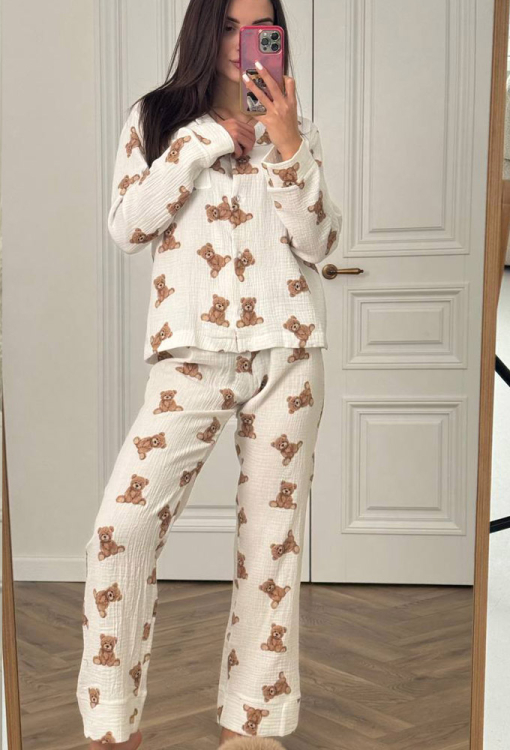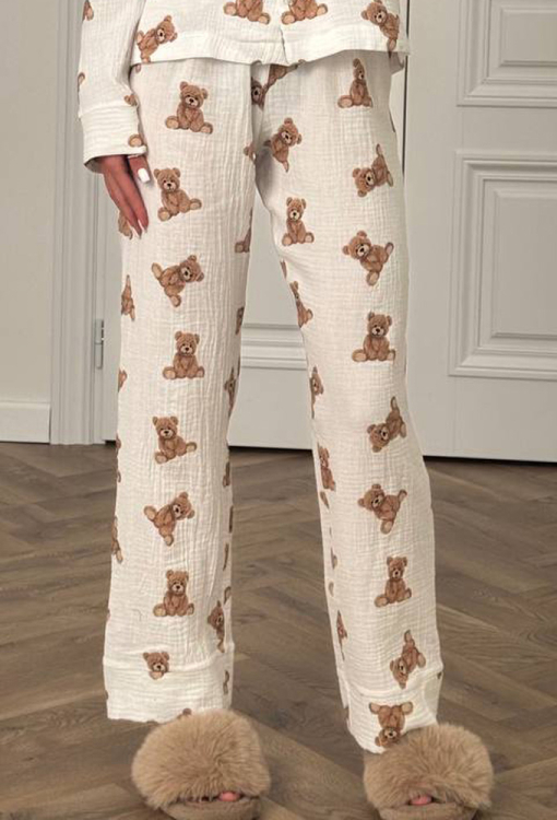 Очаровательная женская пижама от украинского бренда V.Velika. Пижама выполнена из мягкого и качественного муслина, бежевого цвета с принтом в виде забавных плюшевых мишек коричневого цвета, состоит из рубашки и штанов прямого силуэта. Рубашка с длинными рукавами на свободных манжетах и отложным воротником, застегивается на пуговицы, на груди слева модель украшена маленьким накладным карманчиком. Штаны с удобной посадкой и мягкой резинкой в поясе, внизу обработаны свободными манжетами. Пижама очень красивая и комфортная, подойдет в качестве домашней одежды, а также может быть отличным подарком любимому или близкому человеку.