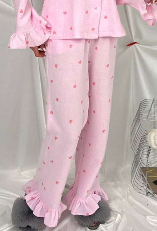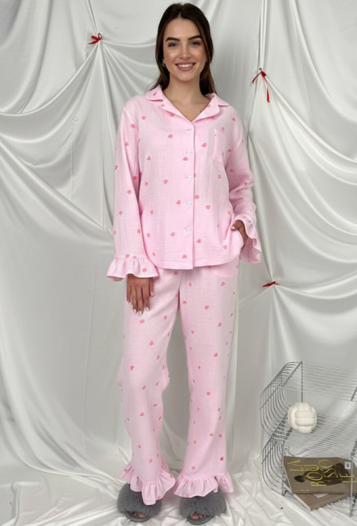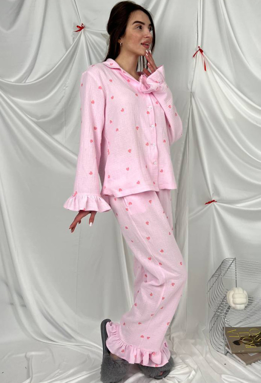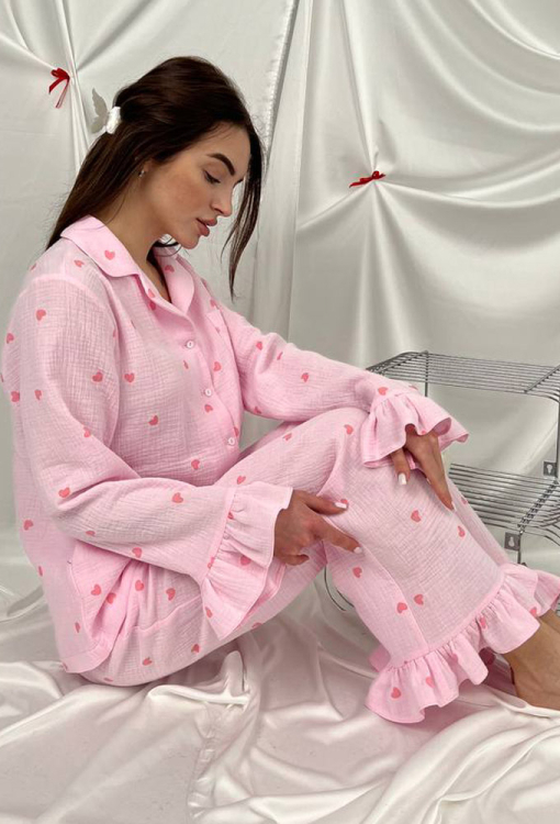 Очаровательная женская пижама от украинского бренда V.Velika. Пижама выполнена из мягкого и качественного муслина, розового цвета в розовые сердечки, состоит из рубашки и штанов свободного oversize силуэта. Рубашка с длинными рукавами и отложным воротником, застегивается на пуговицы, вверху украшена двумя накладными карманчиками. Штаны с высокой посадкой, мягкой резинкой в поясе и удобными боковыми карманами. Рукава рубашки и низ штанов оформлены широкими рюшами. Пижама очень красивая и комфортная, придаст образу романтического настроения, а также может быть отличным подарком любимому или близкому человеку.