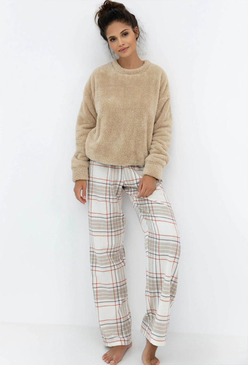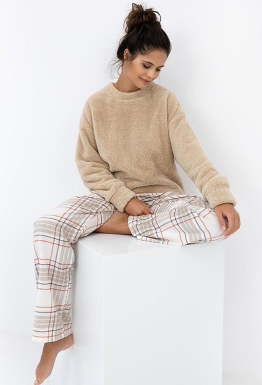 Женская теплая пижама Joyce от польского бренда Sensis- это идеальное сочетание уюта, тепла и стильного домашнего образа. Пижама, выполненная из качественного и мягкого материала, включает плюшевую кофту бежевого цвета и фланелевые штаны в белую клетку с бежевыми и терракотовыми акцентами. Плюшевая кофта с длинными рукавами, круглым вырезом и манжетами дарит особое тепло и комфорт. Прямые штаны с мягкой резинкой на талии обеспечивают свободу движений и удобную посадку. Пижама не только уютная и невероятно приятная к телу - она моментально становится любимым комплектом для отдыха и прекрасным подарком для близкого человека.