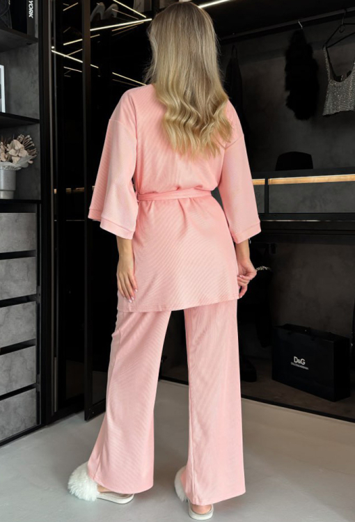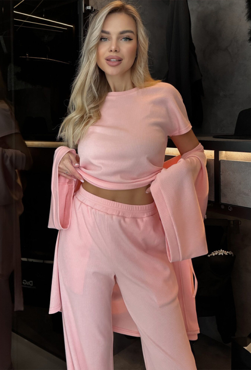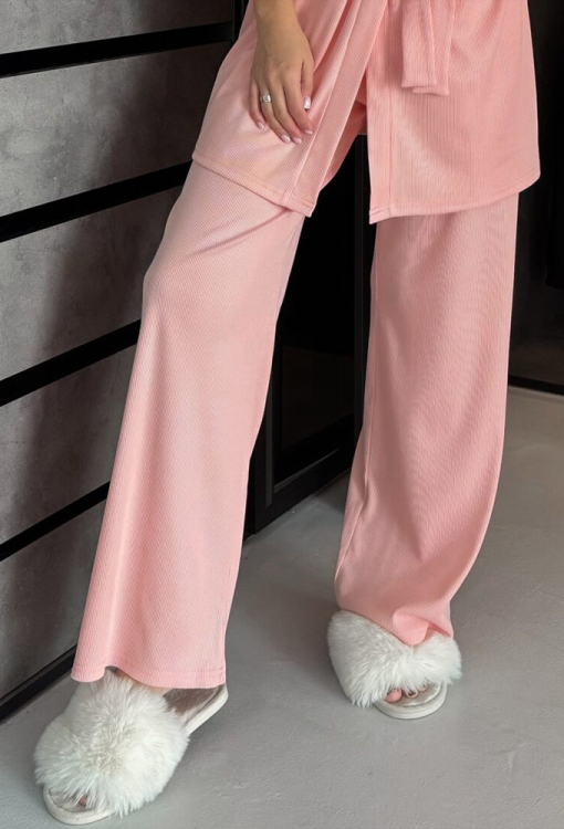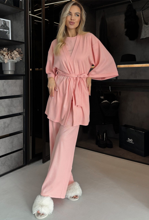 Стильная и практичная женская пижама с халатом от украинского бренда Julia Ulich. Комплект выполнен из мягкого и качественного хлопка в рубчик персикового цвета, состоит из футболки прямого силуэта, штанов свободного кроя и короткого халата. Футболка с короткими рукавами и круглым вырезом горла, штаны с мягкой резинкой в поясе и удобными боковыми карманами. Халат свободного кроя с широкими рукавами 3/4 длины и заниженным плечевым швом, завязывается на запах с помощью пояса. Комплект очень красивый и приятная к телу, идеальна для сна и домашнего отдыха, также может быть прекрасным подарком любимому и близкому человеку!
