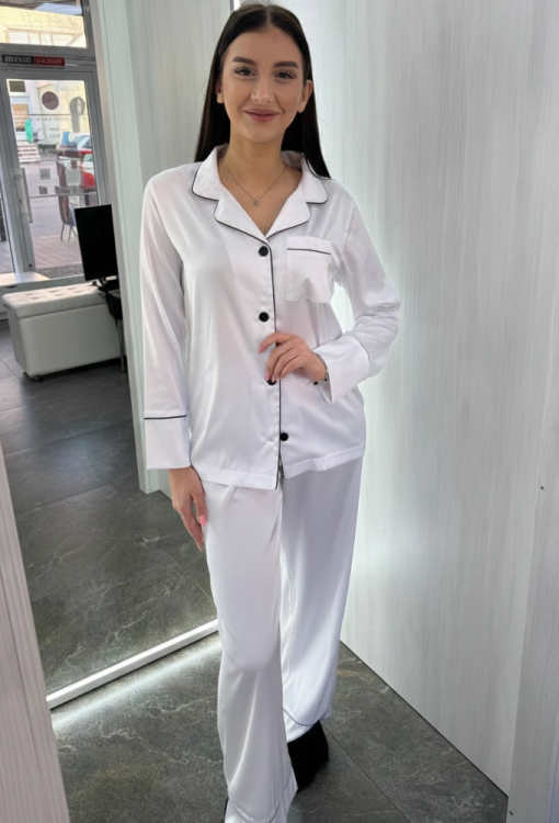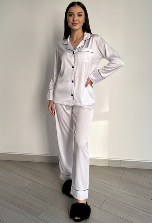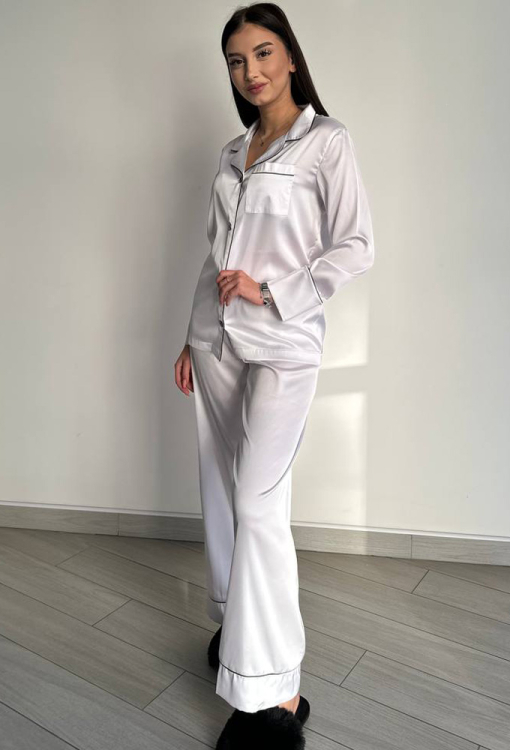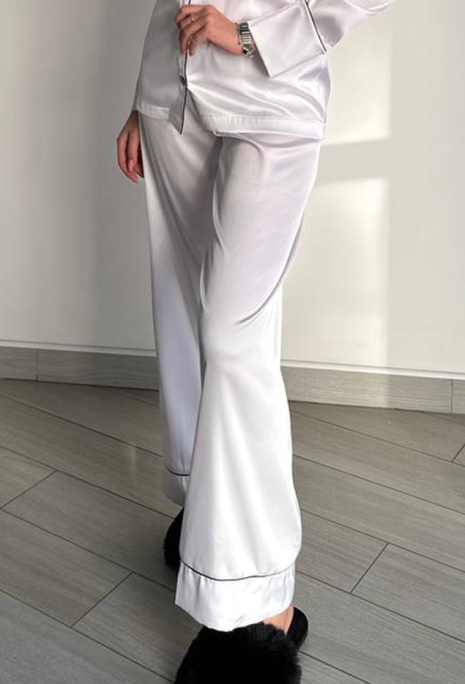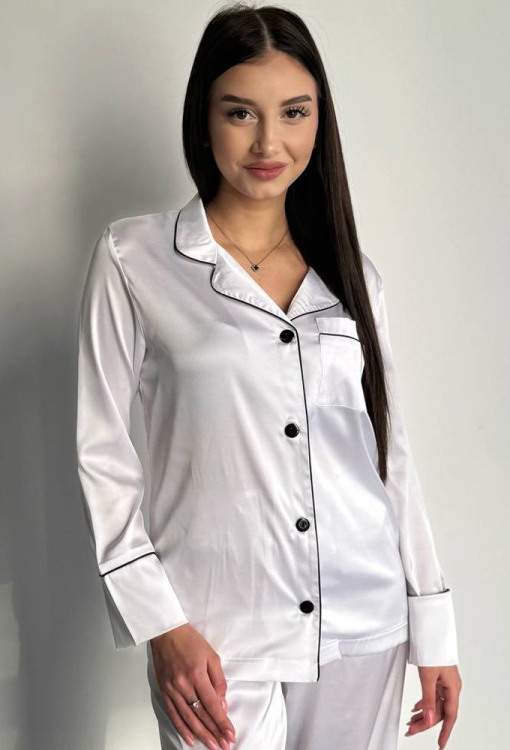 Нежная женская пижама от украинского бренда BO.Brand. Пижама выполнена из качественного и мягкого шелка Армани белого цвета, состоит из рубашки прямого силуэта и широких штанов. Рубашка с длинными рукавами на свободных манжетах и отложным воротником, застегивается на пуговицы, на груди слева украшена маленьким карманчиком. Воротник, полки, рукава и карман модели обработаны тонким кантом черного цвета. Штаны с удобной посадкой и мягкой резинкой в поясе, внизу обработаны свободными манжетами и украшены контрастным кантом. Пижама очень красивая, легкая и комфортная, идеальна для сна и домашнего отдыха, а также может быть замечательным подарком любимому и близкому человеку.