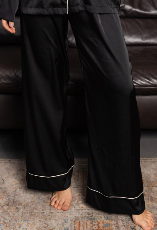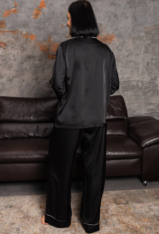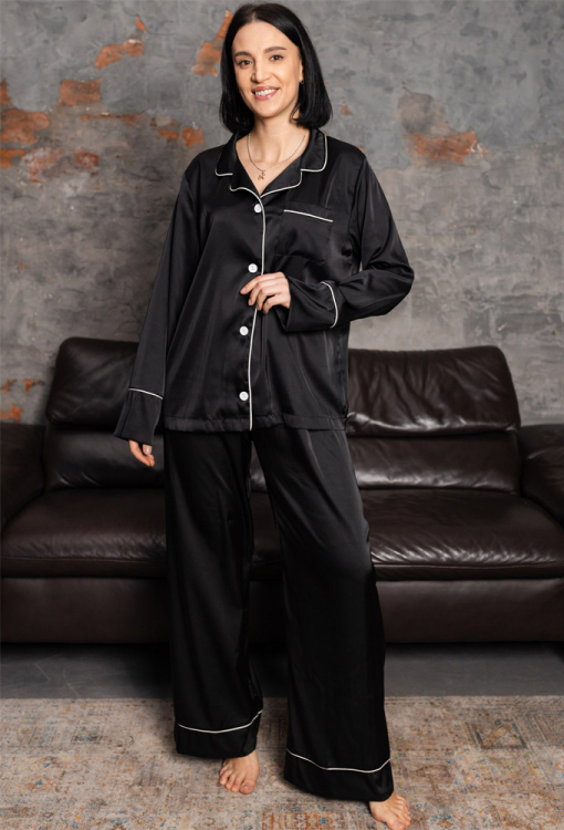 Стильная женская пижама от украинского бренда BO.Brand. Пижама выполнена из качественного и мягкого шелка Армани черного цвета, состоит из рубашки и штанов свободного силуэта. Рубашка с длинными рукавами и отложным воротником, застегивается на пуговицы, на груди слева украшена маленьким накладным карманчиком. Воротник, полки, рукава и карман модели обработаны тонким кантом белого цвета. Штаны с удобной посадкой и мягкой резинкой в поясе, внизу обработаны свободными манжетами с контрастным кантом. Пижама очень красивая и комфортная, идеальна для сна и домашнего отдыха, а также может быть замечательным подарком любимому и близкому человеку.
