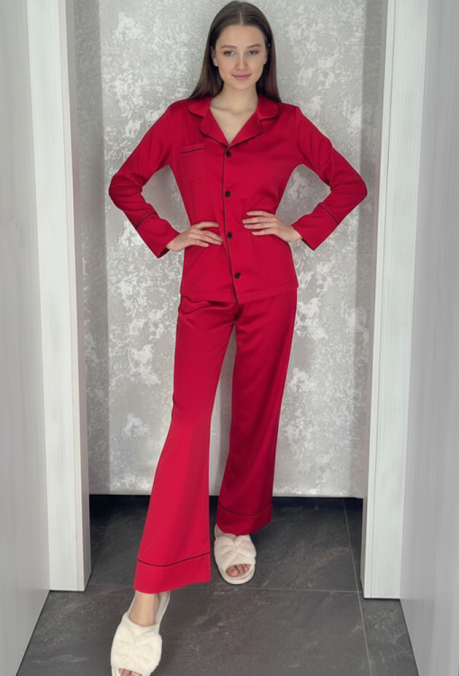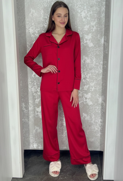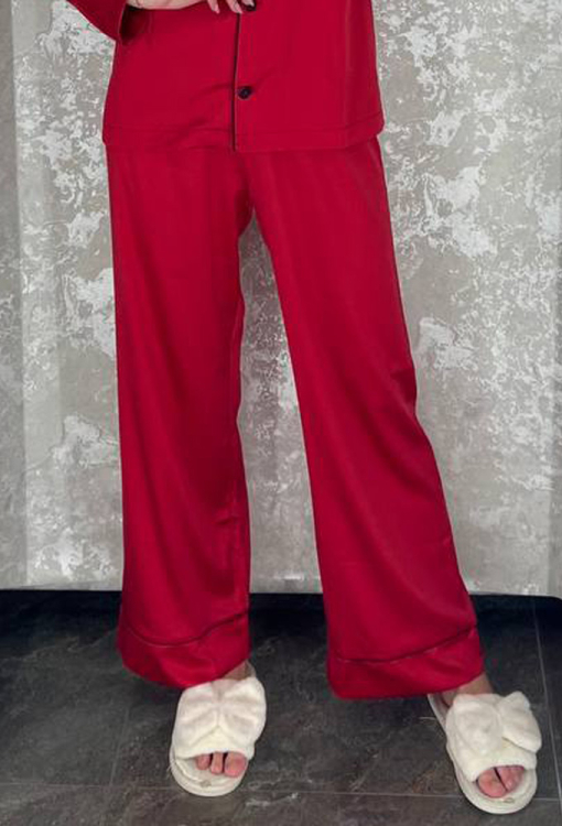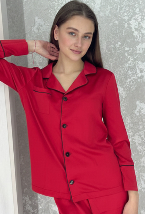 Яркая женская пижама от украинского бренда BO.Brand. Пижама выполнена из качественного и мягкого шелка Армани красного цвета, состоит из рубашки прямого силуэта и свободных штанов. Рубашка с длинными рукавами на свободных манжетах и отложным воротником, застегивается на пуговицы, на груди украшена маленьким карманчиком. Воротник, полки, рукава и карман модели обработані тонким кантом черного цвета. Штаны с мягкой резинкой в поясе, свободными манжетами и контрастнім кантом, создают комфортную посадку, не стесняют движений. Пижама очень красивая и удобная, идеальна для сна и домашнего отдыха, а также может быть замечательным подарком любимому и близкому человеку.