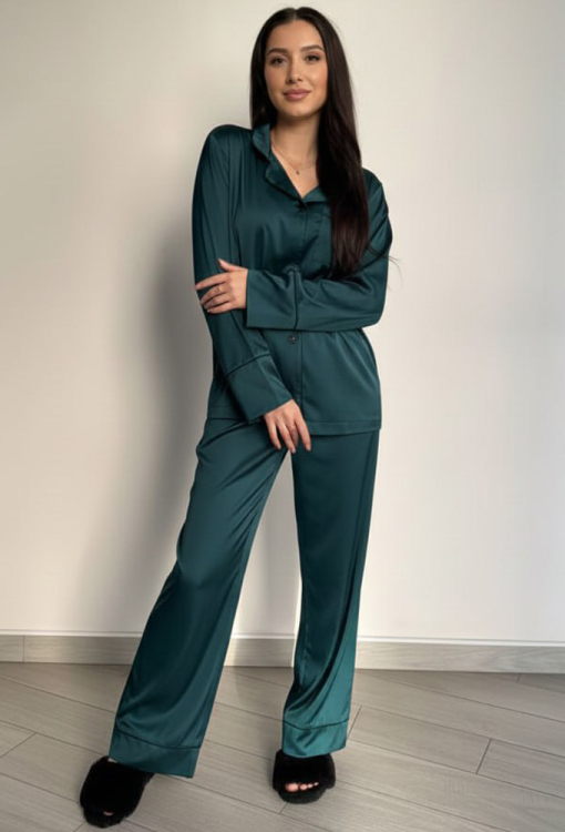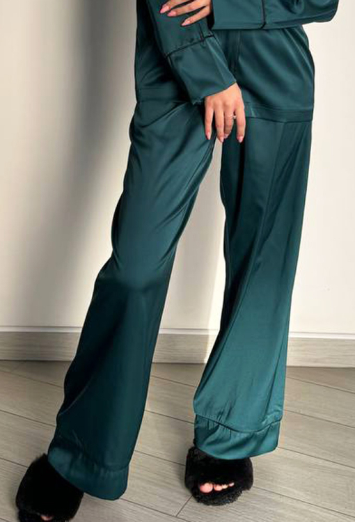 Изысканная женская пижама от украинского бренда BO.Brand. Пижама выполнена из качественного и мягкого шелка Армани изумрудного цвета, состоит из рубашки прямого силуэта и широких штанов. Рубашка с длинными рукавами на свободных манжетах и отложным воротником, застегивается на пуговицы, на груди слева украшена маленьким карманчиком. Воротник, полки, рукава и карман модели обработаны тонким кантом черного цвета. Штаны с удобной посадкой и мягкой резинкой в поясе, внизу обработаны свободными манжетами и украшены контрастным кантом. Пижама очень красивая, легкая и комфортная, идеальна для сна и домашнего отдыха, а также может быть замечательным подарком любимому и близкому человеку.
