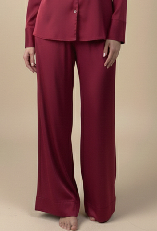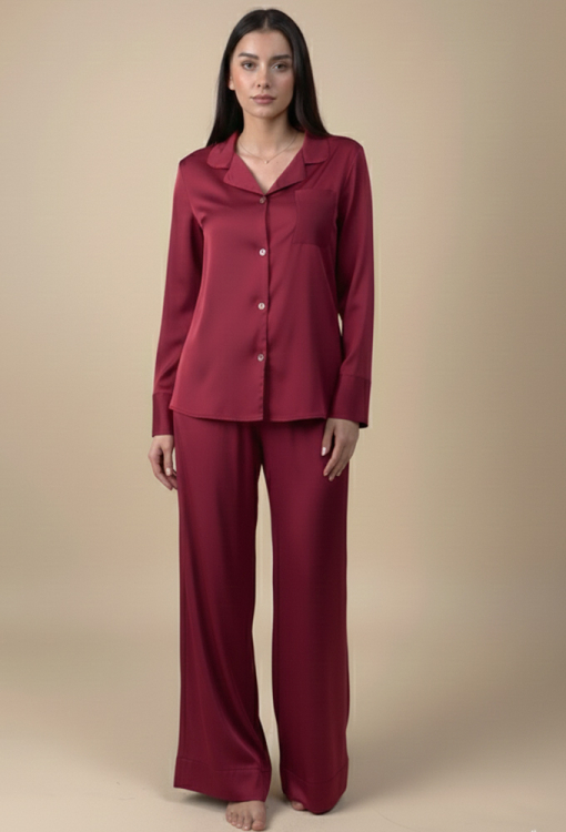 Красивая женская пижама от украинского бренда BO.Brand. Пижама выполнена из качественного и мягкого шелка Армани вишневого цвета, состоит из рубашки прямого силуэта и свободных штанов. Рубашка с длинными рукавами на свободных манжетах и отложным воротником, застегивается на пуговицы, на груди слева украшена маленьким карманчиком. Штаны с мягкой резинкой в поясе и свободными манжетами внизу, создают комфортную посадку, не стесняют движений. Пижама стильная и удобная, идеальна для сна и домашнего отдыха, а также может быть замечательным подарком любимому и близкому человеку.