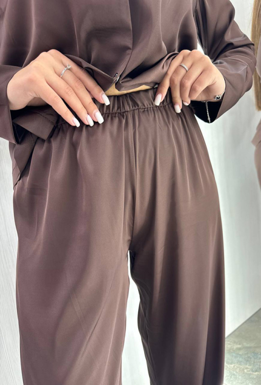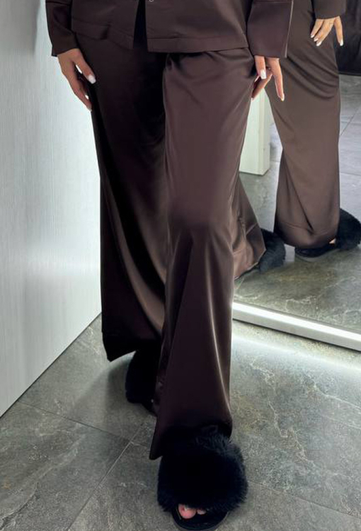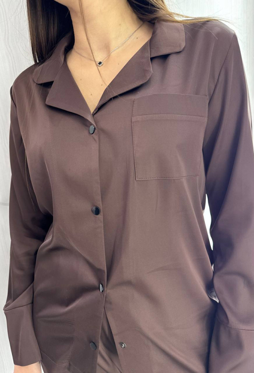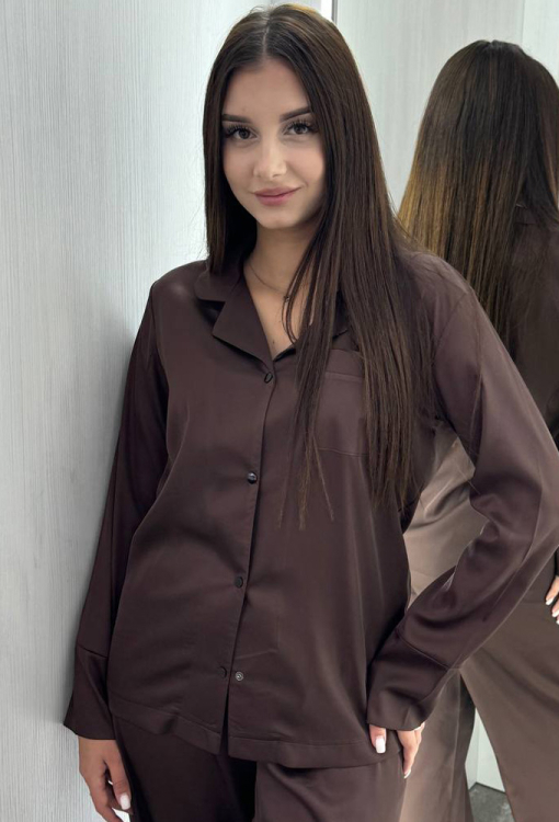 Классическая женская пижама от украинского бренда BO.Brand. Пижама выполнена из качественного и мягкого шелка Армани шоколадного цвета, состоит из рубашки прямого силуэта и свободных штанов. Рубашка с длинными рукавами на свободных манжетах и отложным воротником, застегивается на пуговицы, на груди слева украшена маленьким карманчиком. Штаны с мягкой резинкой в поясе и свободными манжетами внизу, создают комфортную посадку, не стесняют движений. Пижама стильная и удобная, идеальна для сна и домашнего отдыха, а также может быть замечательным подарком любимому и близкому человеку.