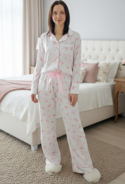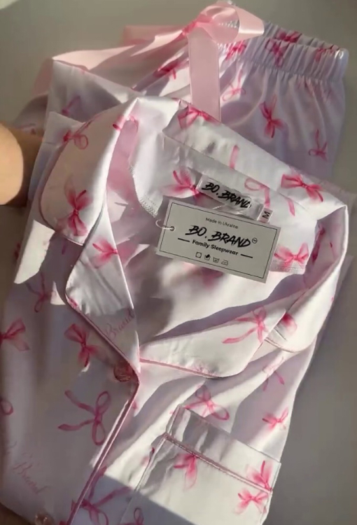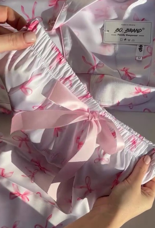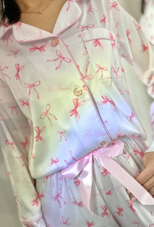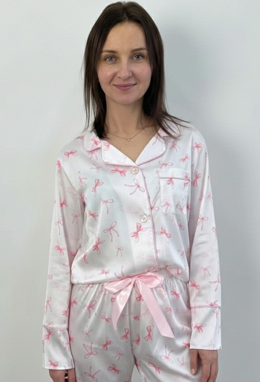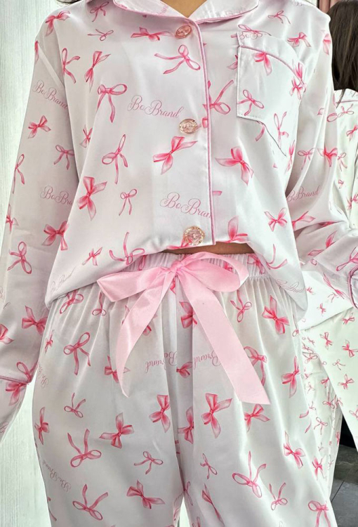 Красивая женская пижама от украинского бренда BO.Brand. Пижама выполнена из качественного и мягкого шелка Армани светло-розового цвета в принт из розовых бантиков, состоит из рубашки прямого силуэта и свободных штанов. Рубашка с длинными рукавами и отложным воротником, застегивается на пуговицы, на груди слева украшена маленьким накладным карманчиком. Воротник, полки, рукава и карман модели обработаны тонким кантом розового цвета. Штаны с мягкой резинкой в поясе украшены атласным бантиком розового цвета, внизу обработаны свободными манжетами с розовым кантом. Пижама стильная и очень комфортная, идеальна для сна и домашнего отдыха, а также может быть замечательным подарком любимому и близкому человеку.