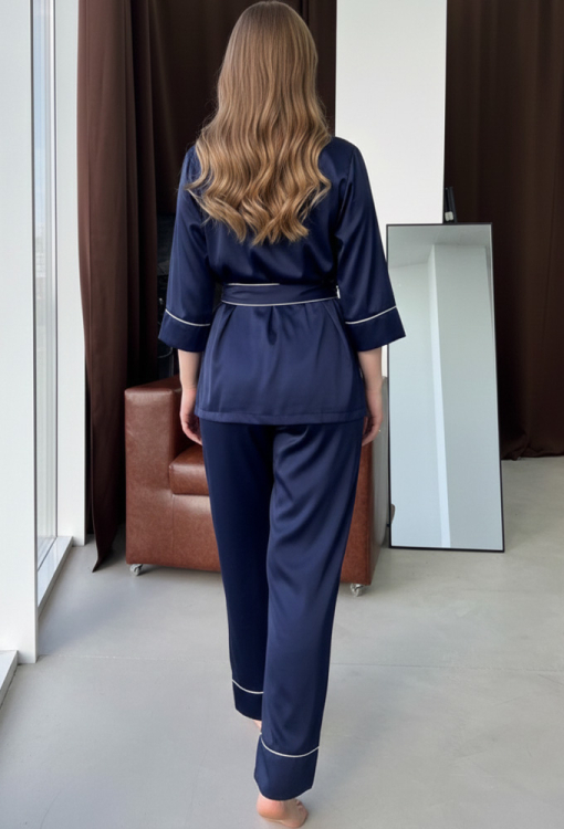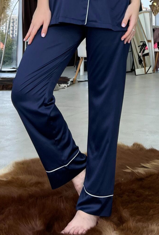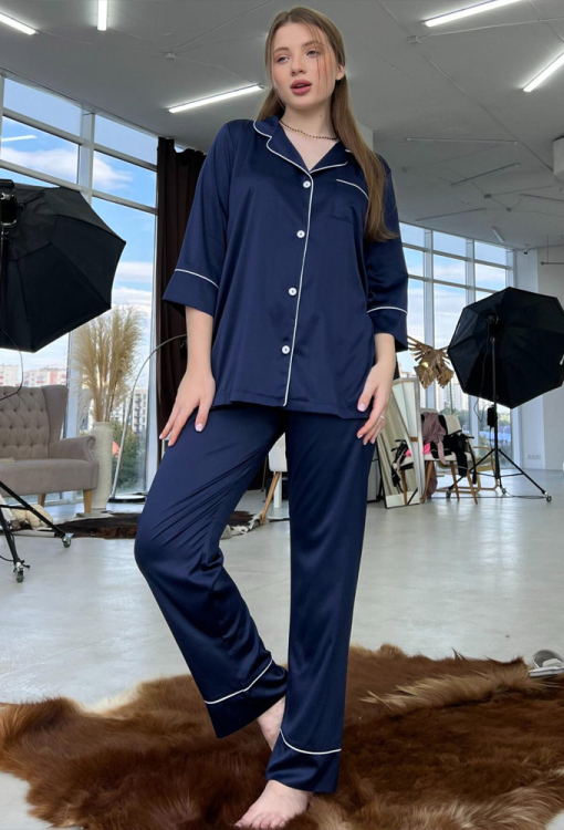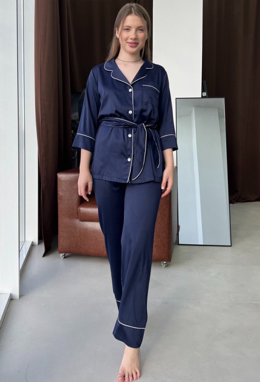 Стильная женская пижама от украинского бренда BO.Brand. Пижама выполнена из качественного и мягкого шелка Армани синего цвета, состоит из рубашки со штанами прямого силуэта. Рубашка с рукавами 3/4 на свободных манжетах и отложным воротником, застегивается на пуговицы и завязывается поясом, на груди слева украшена маленьким карманчиком. Воротник, полки, рукава, карман и пояс модели обработаны тонким кантом белого цвета. Штаны с мягкой резинкой в поясе, внизу обработаны свободными манжетами и украшены контрастным кантом. Пижама очень красивая, легкая и комфортная, идеальна для сна и домашнего отдыха, а также может быть замечательным подарком любимому и близкому человеку.