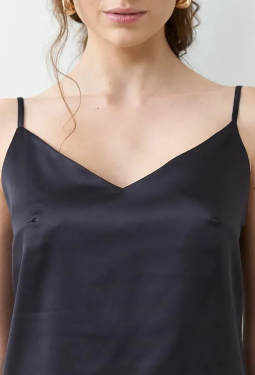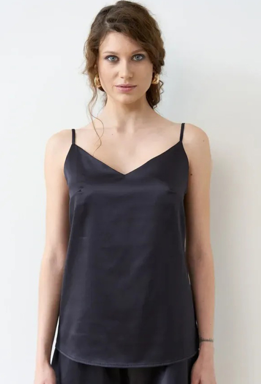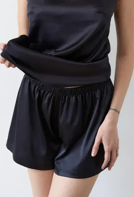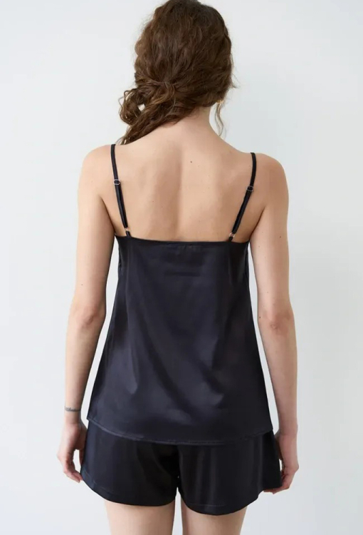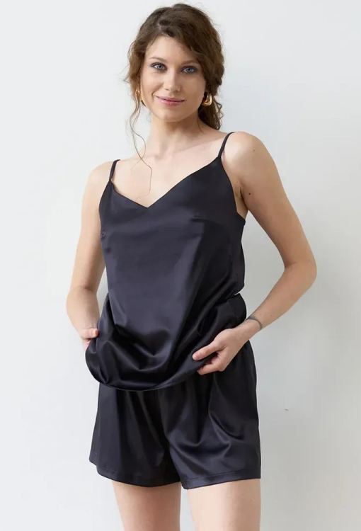 Легкая воздушная женская пижама из коллекции Classic от итальянского бренда Effetto. Пижама выполнена из мягкого и качественного сатина с шелковым блеском черного цвета, состоит из майки свободного силуэта и коротких шорт. Майка на тонких регулируемых бретелях и с V-образным декольте, шорты прямого кроя и с мягкой резинкой в поясе. Пижама очень красивая и удобная, подчеркнет сексуальность домашнего образа и обеспечит комфорт во время сна, а также может быть замечательным подарком любимому и близкому человеку.