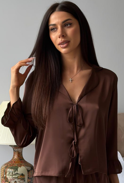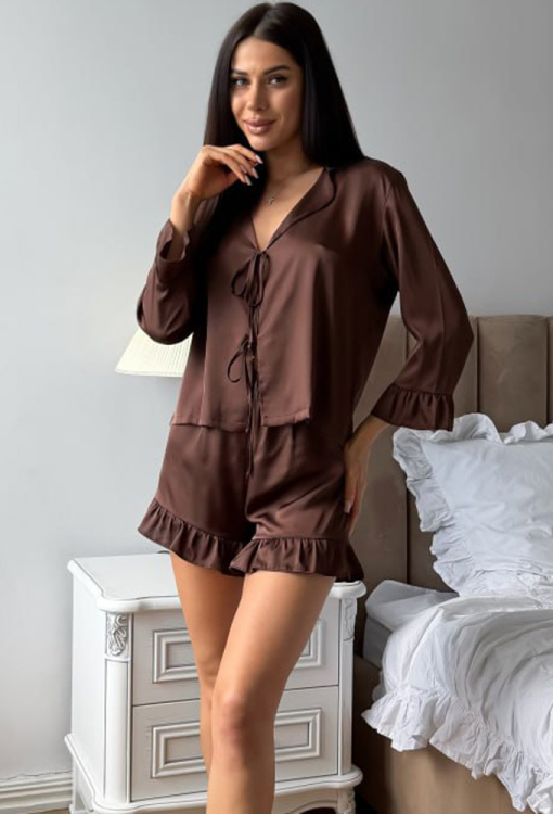 Очаровательная женская пижама от украинского бренда Julia Ulich. Пижама выполнена из мягкого и качественного шелк-сатина коричневого цвета, состоит из рубашки и шортов свободного силуэта. Рубашка с рукавами 7/8 и отложным воротником, завязывается на завязки, рукава обработаны рюшами. Шорты с мягкой резинкой в поясе и игривыми рюшами внизу. Пижама очень красивая и комфортная, идеальна для приятного сна и уютного домашнего отдыха, также может быть прекрасным подарком любимому и близкому человеку!