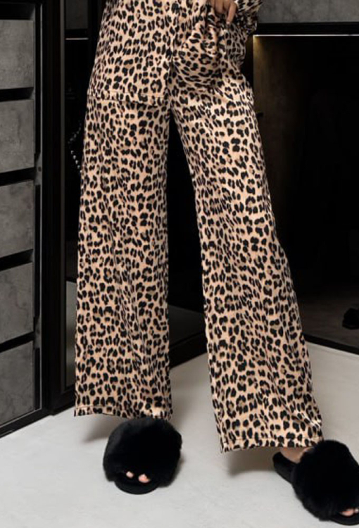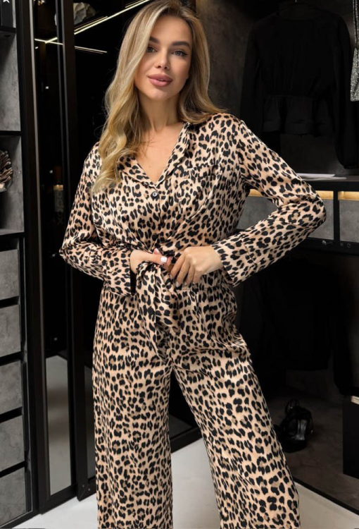 Экстравагантная женская пижама от украинского бренда Julia Ulich. Пижама выполнена из мягкого и качественного шелк-сатина, бежевого цвета в черный леопардовый принт, состоит из рубашки и штанов прямого силуэта. Рубашка с длинными рукавами и отложным воротником, застегивается на пуговицы, на груди слева украшена накладным карманчиком, рукава обработаны свободными манжетами. Штаны с удобной посадкой и мягкой резинкой в поясе. Пижама очень красивая и комфортная, подойдет не только для сна, но и для уютного домашнего отдыха, также может быть прекрасным подарком любимому и близкому человеку!