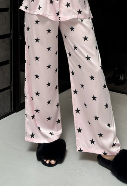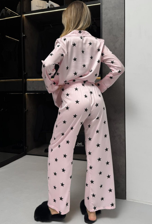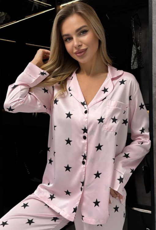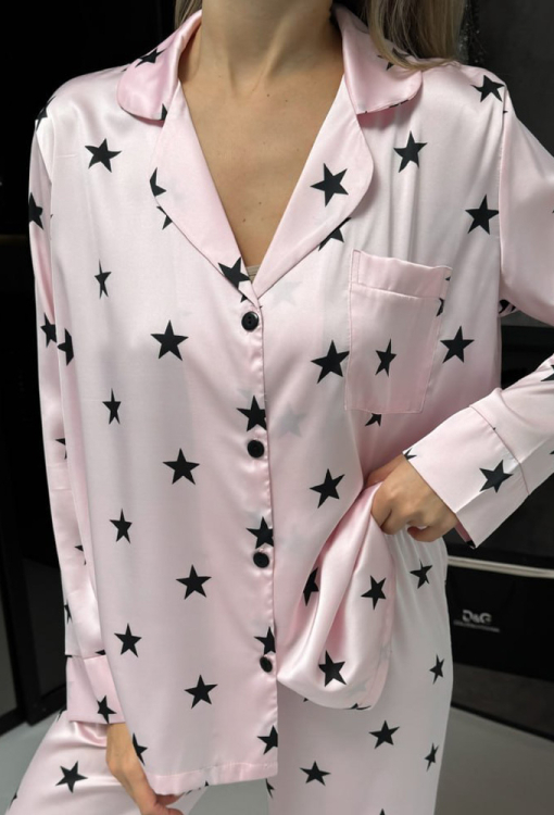 Стильная женская пижама от украинского бренда Julia Ulich. Пижама выполнена из мягкого и качественного шелк-сатина, розового цвета в принт из звезд черного цвета, состоит из рубашки и штанов прямого силуэта. Рубашка с длинными рукавами и отложным воротником, застегивается на пуговицы, на груди слева украшена накладным карманчиком, рукава обработаны свободными манжетами. Штаны с удобной посадкой и мягкой резинкой в поясе. Пижама очень красивая и комфортная, подойдет не только для сна, но и для уютного домашнего отдыха, также может быть прекрасным подарком любимому и близкому человеку!