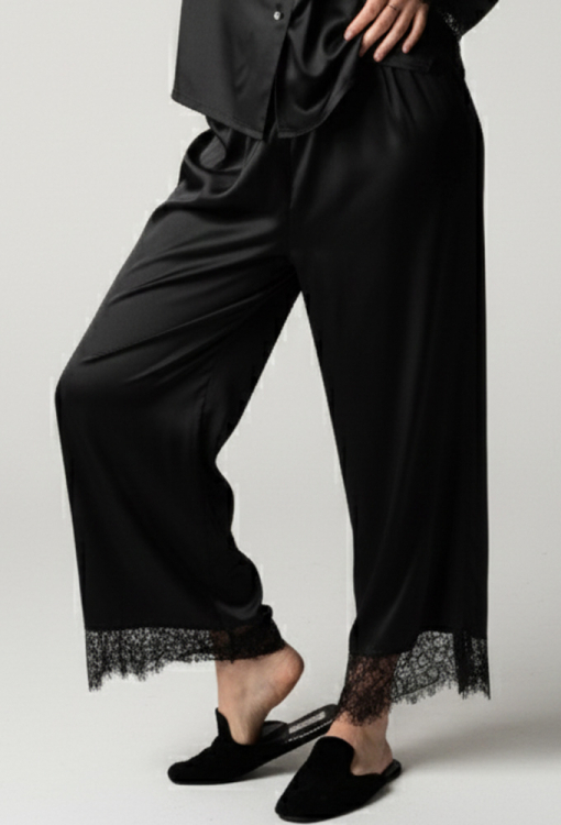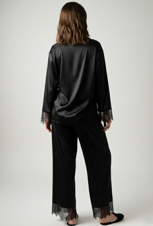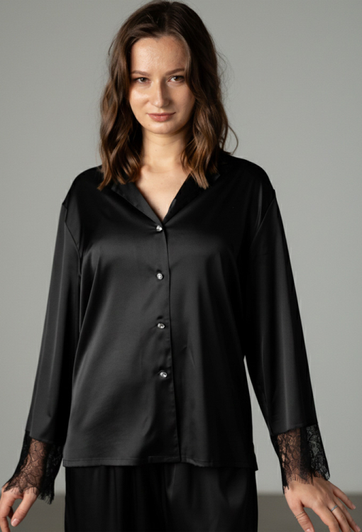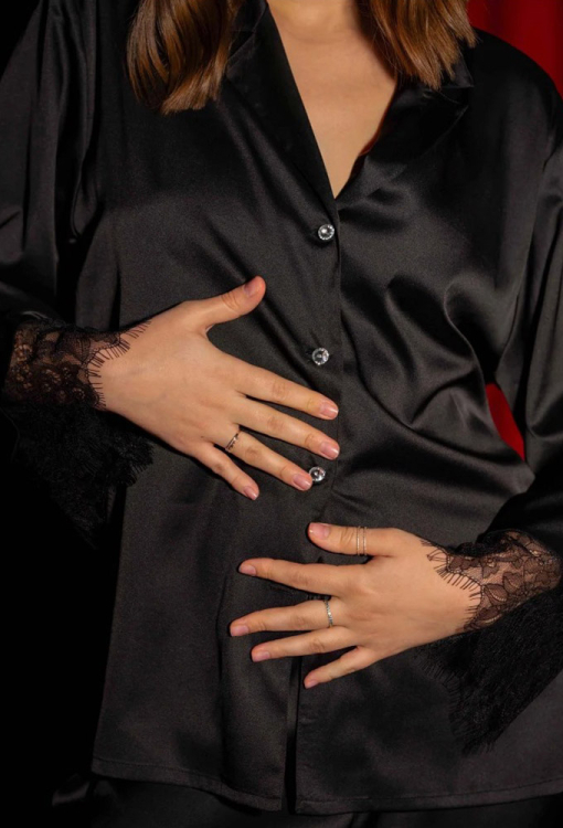 Шикарная женская пижама Дженифер от украинского бренда German Volf. Пижама выполнена из качественного и мягкого смесового шелка черного цвета, состоит из рубашки и штанов свободного силуэта. Рубашка с длинными рукавами и отложным воротником, застегивается на пуговицы. Рукава модели украшены широкими вставками из ажурного кружева с фигурным краем, пуговицы выполнены из стразов. Штаны с удобной посадкой и мягкой резинкой в поясе, внизу украшены кружевными вставками. Пижама очень красивая и комфортная, подойдет для особенных моментом дома, а также может быть отличным подарком близким людям!