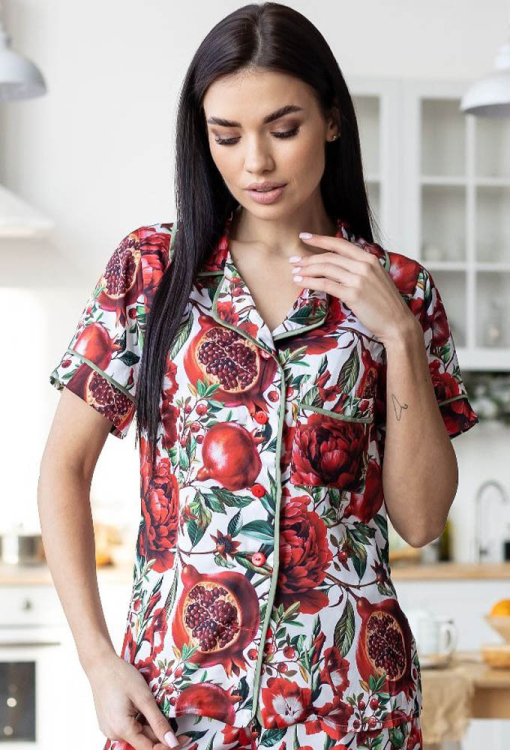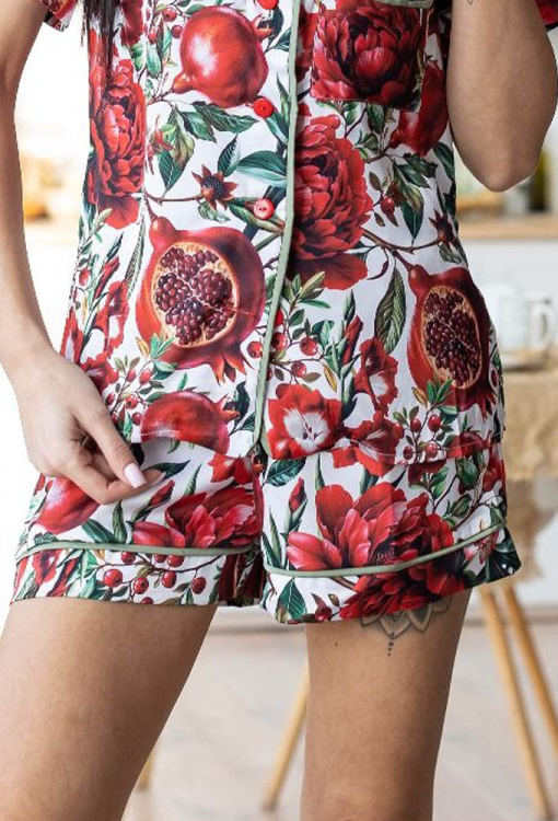 Яркая женская пижама от украинского бренда MiaNaGreen. Пижама выполнена из мягкого и качественного искусственного шелка, кремового цвета в эффектный принт плодов и цветов граната красного цвета и зеленых листьев, состоит из рубашки и шорт прямого силуэта. Рубашка с короткими рукавами, отложным воротником и накладным карманом на груди, застегивается на пуговицы. Воротник полки, рукава и карман модели украшены тонким кантом зеленого цвета. Шорты с удобной посадкой и мягкой резинкой в поясе, регулируются по ширине с помощью внутреннего шнурка зеленого цвета, внизу оформлены однотонным кантом. Пижама очень красивая и комфортная, идеальна для сна и домашнего отдыха, а также может быть отличным подарком близкому или любимому человеку.