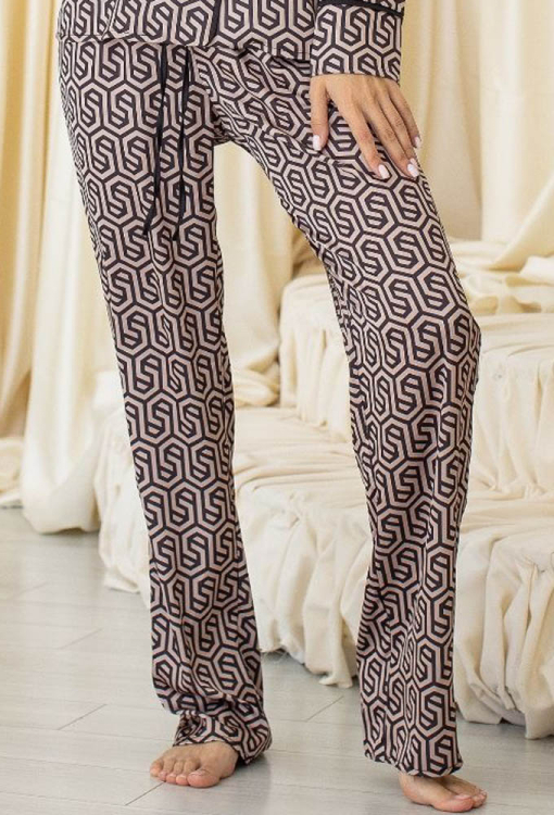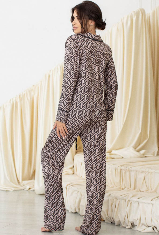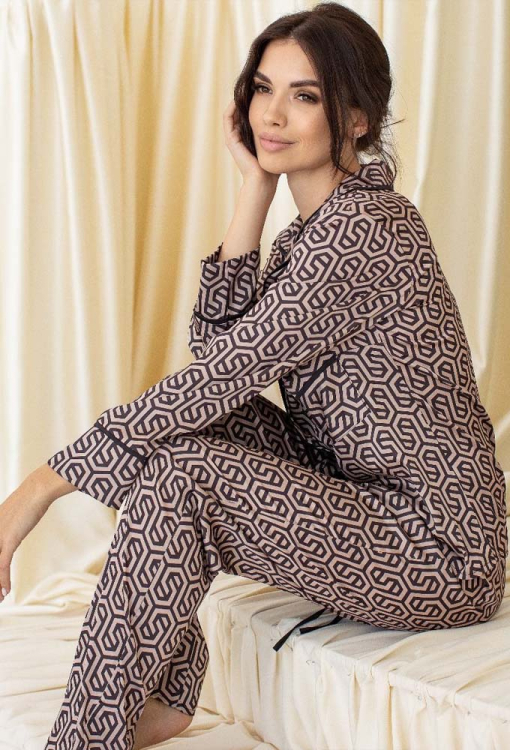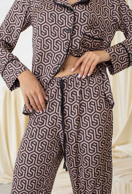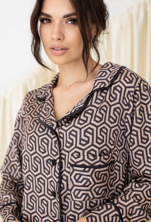 Стильная женская пижама от украинского бренда MiaNaGreen. Пижама выполнена из мягкого и качественного искусственного шелка, бежевого цвета в черный графический принт, состоит из рубашки и штанов прямого силуэта. Рубашка с длинными рукавами, отложным воротником и накладным карманом на груди, застегивается на пуговицы. Воротник полки, рукава и карман модели украшены тонким кантом черного цвета. Штаны с удобной посадкой и мягкой резинкой в поясе, регулируются по ширине с помощью внутреннего шнурка черного цвета. Пижама очень красивая и комфортная, идеальна для сна и домашнего отдыха, а также может быть отличным подарком близкому или любимому человеку.
