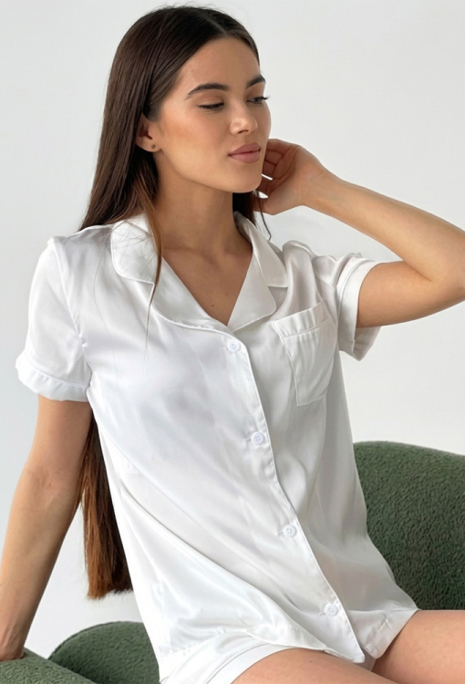 Нежная женская пижама от украинского бренда V.Velika. Пижама выполнена из качественного и мягкого шелка Армани кремового цвета, состоит из рубашки прямого силуэта и коротких шорт. Рубашка с короткими рукавами, отложным воротником и маленьким нагрудным карманчиком, застегивается на пуговицы. Воротник, полки, рукава и карман модели украшены тонким кантом белого цвета. Шорты с удобной посадкой и мягкой резинкой в поясе, внизу оформлены белым кантом. Пижама невероятно красивая и комфортная, идеальна как для сна, так и для уютного домашнего отдыха или подарка любиму и близкому человеку.