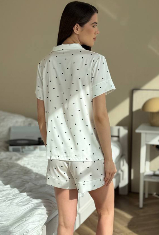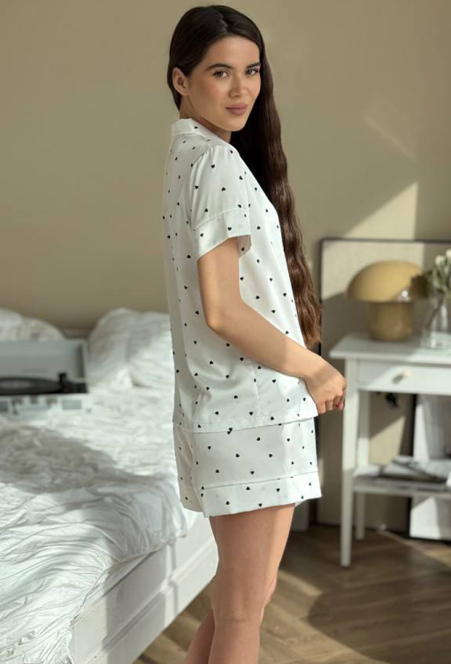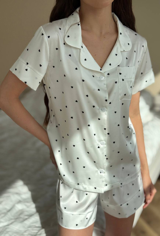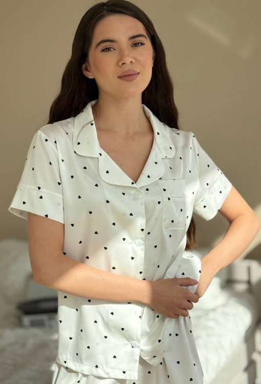Нежная женская пижама от украинского бренда V.Velika. Пижама выполнена из качественного и мягкого шелка кремового цвета с принтом в виде мелких сердечек черного цвета, состоит из рубашки и шорт свободного силуэта. Рубашка с короткими рукавами, отложным воротником и маленьким нагрудным карманчиком, застегивается на пуговицы, рукава обработаны свободными манжетами. Шорты с мягкой резинкой в поясе и свободными манжетами, регулируются по ширине с помощью внутреннего шнурка. Пижама невероятно красивая и комфортная, идеальна как для сна, так и для уютного домашнего отдыха или подарка любиму и близкому человеку.