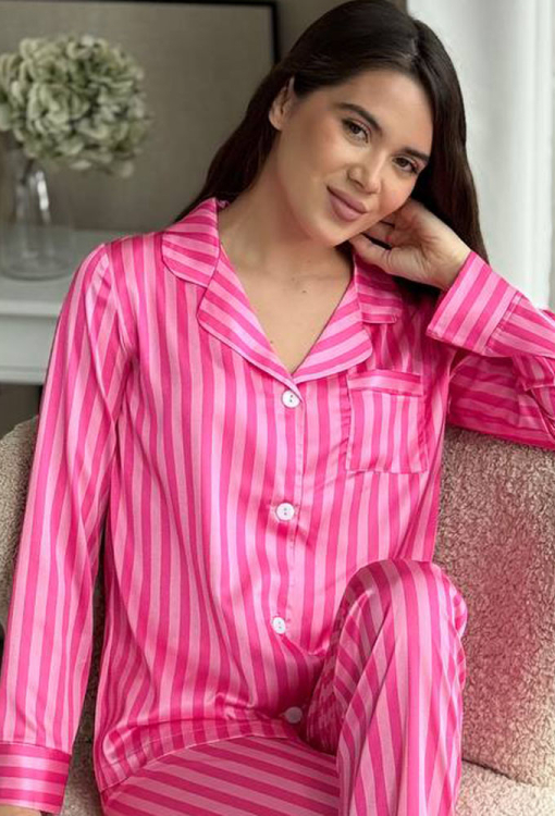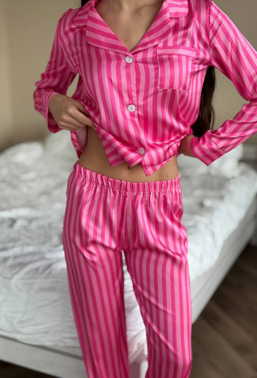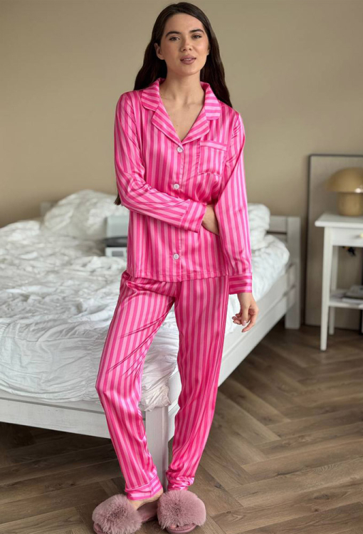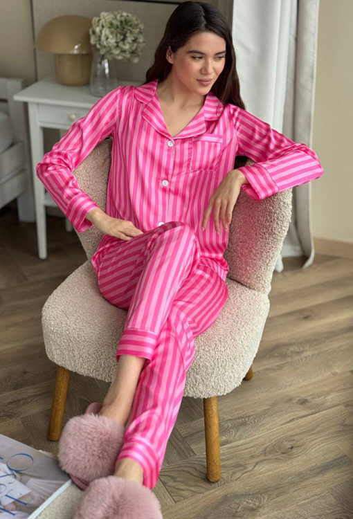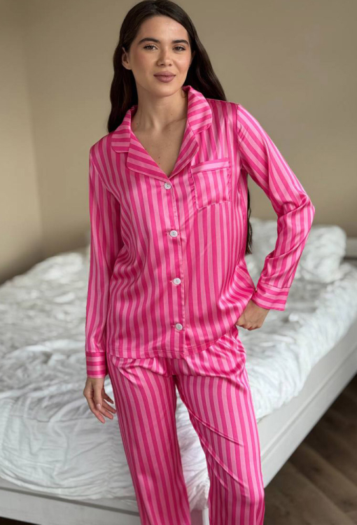 Яркая женская пижама от украинского бренда V.Velika. Пижама выполнена из качественного и мягкого шелка темно-малинового цвета с розовым полосатым принтом, состоит из рубашки прямого силуэта и слегка зауженных штанов. Рубашка с длинными рукавами, отложным воротником и маленьким нагрудным карманчиком, застегивается на пуговицы, рукава обработаны свободными манжетами. Штаны со средней посадкой и мягкой резинкой в поясе, внизу оформлены свободными манжетами. Пижама невероятно красивая и комфортная, идеальна как для сна, так и для уютного домашнего отдыха или подарка любиму и близкому человеку.