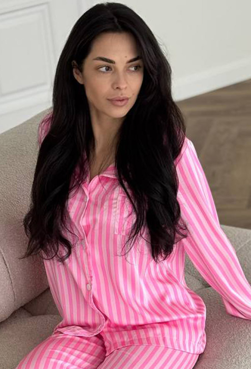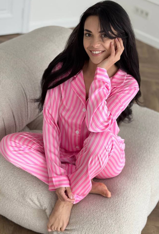 Яркая женская пижама от украинского бренда V.Velika. Пижама выполнена из качественного и мягкого шелка малинового цвета с розовым полосатым принтом, состоит из рубашки прямого силуэта и слегка зауженных штанов. Рубашка с длинными рукавами, отложным воротником и маленьким нагрудным карманчиком, застегивается на пуговицы, рукава обработаны свободными манжетами. Штаны со средней посадкой и мягкой резинкой в поясе, внизу оформлены свободными манжетами. Пижама невероятно красивая и комфортная, идеальна как для сна, так и для уютного домашнего отдыха или подарка любиму и близкому человеку.