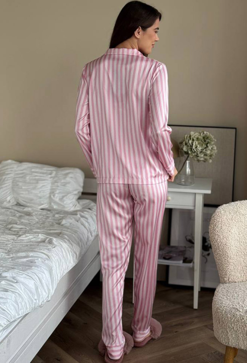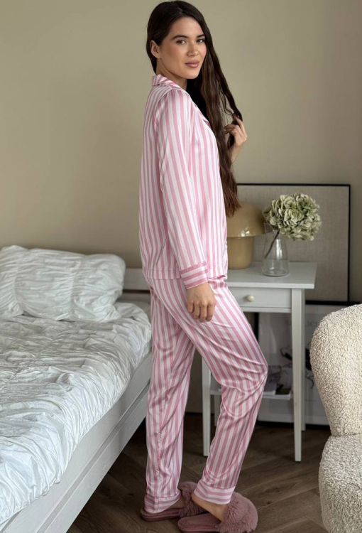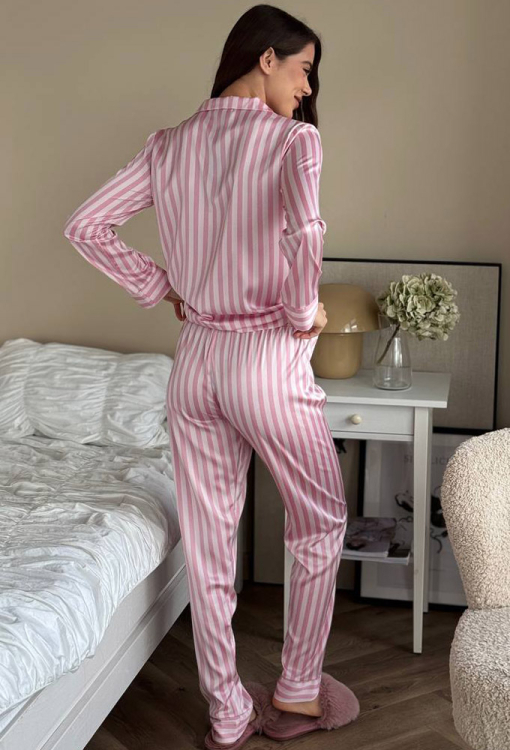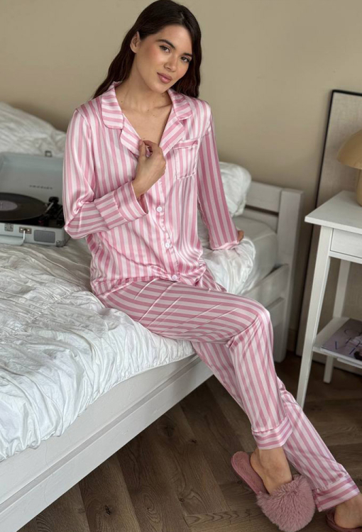 Стильная женская пижама от украинского бренда V.Velika. Пижама выполнена из качественного и мягкого шелка пудрового цвета с белым полосатым принтом, состоит из рубашки прямого силуэта и слегка зауженных штанов. Рубашка с длинными рукавами, отложным воротником и маленьким нагрудным карманчиком, застегивается на пуговицы, рукава обработаны свободными манжетами. Штаны со средней посадкой и мягкой резинкой в поясе, внизу оформлены свободными манжетами. Пижама невероятно красивая и комфортная, идеальна как для сна, так и для уютного домашнего отдыха или подарка любиму и близкому человеку.