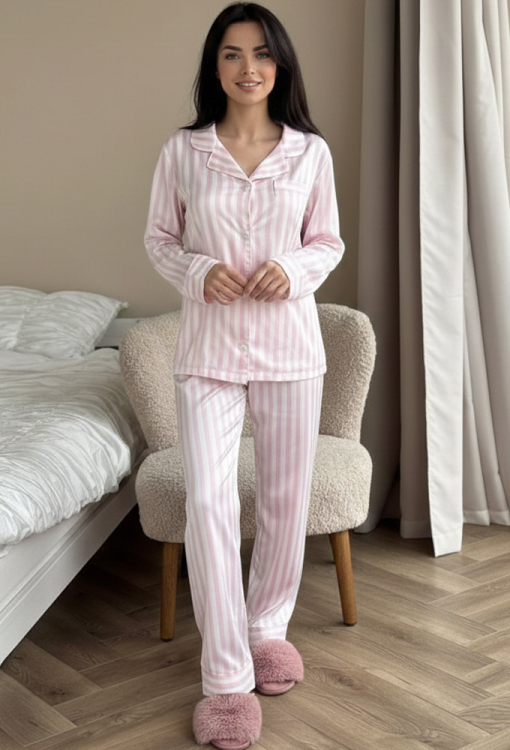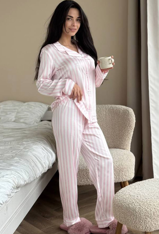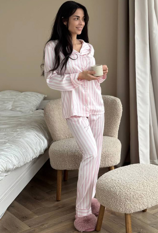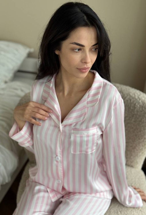 Нежная женская пижама от украинского бренда V.Velika. Пижама выполнена из качественного и мягкого шелка светло-розового цвета с белым полосатым принтом, состоит из рубашки прямого силуэта и слегка зауженных штанов. Рубашка с длинными рукавами, отложным воротником и маленьким нагрудным карманчиком, застегивается на пуговицы, рукава обработаны свободными манжетами. Штаны со средней посадкой и мягкой резинкой в поясе, внизу оформлены свободными манжетами. Пижама невероятно красивая и комфортная, идеальна как для сна, так и для уютного домашнего отдыха или подарка любиму и близкому человеку.