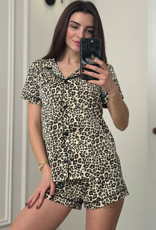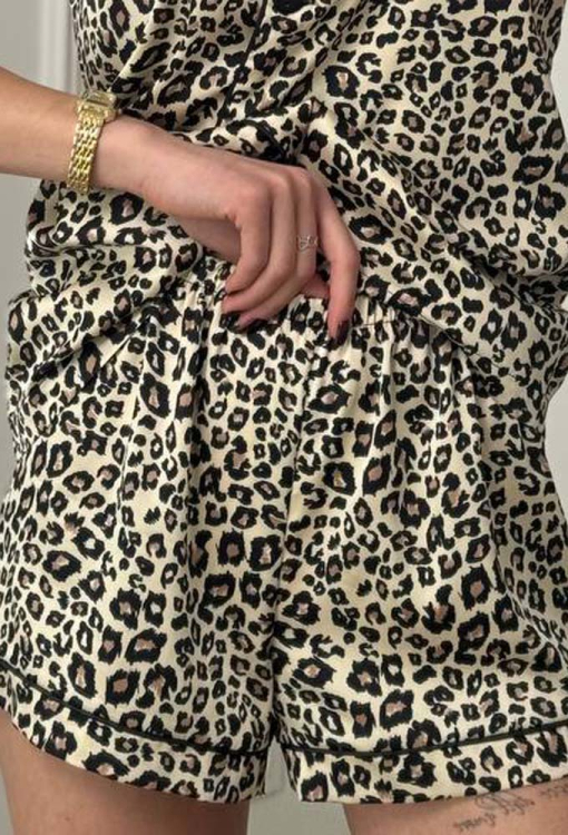 Стильная женская пижама от украинского бренда V.Velika. Пижама выполнена из качественного и мягкого шелка Армани, кремового цвета с леопардовым принтом коричневого и черного цвета, состоит из рубашки прямого силуэта и коротких шорт. Рубашка с короткими рукавами, отложным воротником и маленьким нагрудным карманчиком, застегивается на пуговицы. Воротник, полки, рукава и карман модели украшены тонким кантом черного цвета. Шорты с удобной посадкой и мягкой резинкой в поясе, внизу оформлены контрастным кантом. Пижама невероятно красивая и комфортная, идеальна как для сна, так и для уютного домашнего отдыха или подарка любиму и близкому человеку.