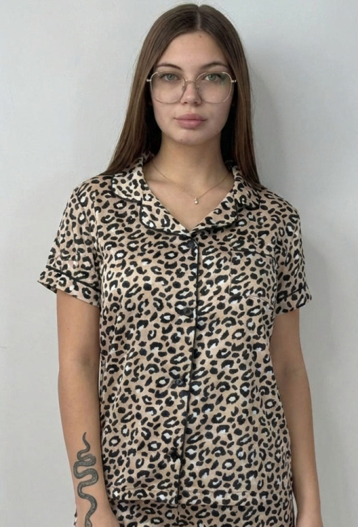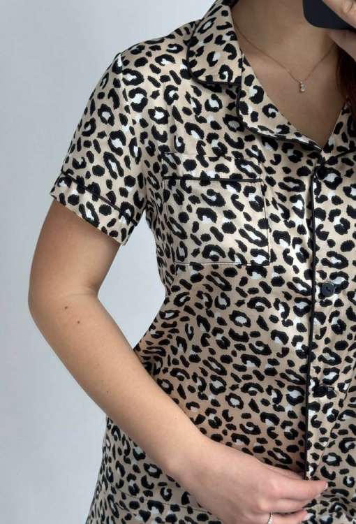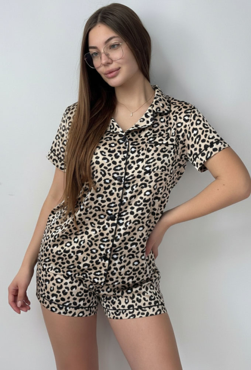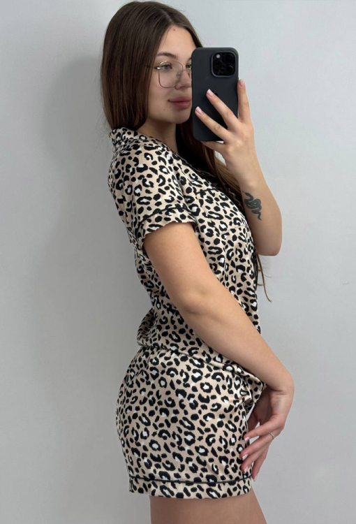 Привлекательная женская пижама от украинского бренда V.Velika. Пижама выполнена из качественного и мягкого шелка Армани, кремового цвета с леопардовым принтом черного цвета, состоит из рубашки прямого силуэта и коротких шорт. Рубашка с короткими рукавами, отложным воротником и маленьким нагрудным карманчиком, застегивается на пуговицы. Воротник, полки, рукава и карман модели украшены тонким кантом черного цвета. Шорты с удобной посадкой и мягкой резинкой в поясе, внизу оформлены контрастным кантом. Пижама невероятно красивая и комфортная, идеальна как для сна, так и для уютного домашнего отдыха или подарка любиму и близкому человеку.