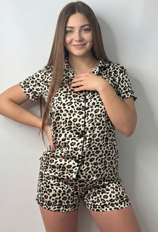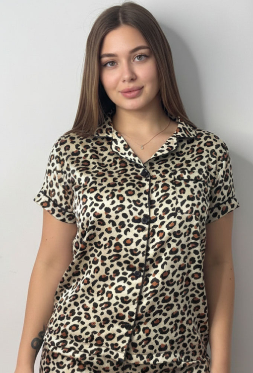 Привлекательная женская пижама от украинского бренда V.Velika. Пижама выполнена из качественного и мягкого шелка Армани, бежевого цвета с леопардовым принтом коричневого и черного цвета, состоит из рубашки и шорт прямого силуэта. Рубашка с короткими рукавами, отложным воротником и маленьким нагрудным карманчиком, застегивается на пуговицы. Воротник, полки, рукава и карман модели украшены тонким кантом черного цвета. Шорты с удобной посадкой и мягкой резинкой в поясе, внизу оформлены контрастным кантом. Пижама невероятно красивая и комфортная, идеальна как для сна, так и для уютного домашнего отдыха или подарка любиму и близкому человеку.