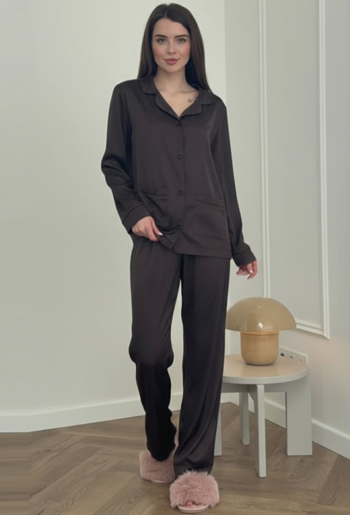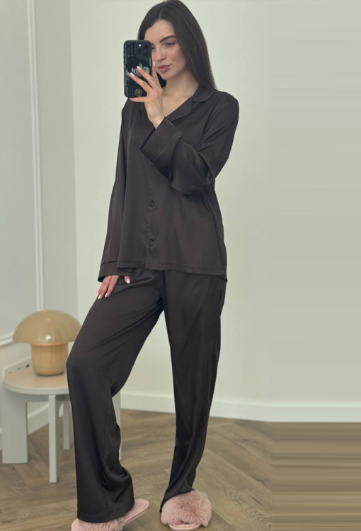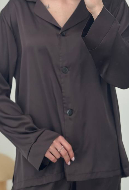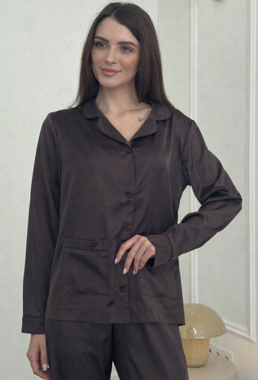 Элегантная женская пижама от украинского бренда V.Velika. Пижама выполнена из качественного и мягкого шелка шоколадного цвета, состоит из рубашки свободного силуэта и прямых штанов. Рубашка с длинными рукавами, отложным воротником и двумя накладными карманами, застегивается на пуговицы. Воротник, полки, рукава и карманы модели украшены тонким кантом черного цвета, внизу по бокам обработаны небольшие разрезы. Штаны с высокой посадкой и мягкой резинкой в поясе, внизу оформлены контрастным кантом. Пижама невероятно красивая и комфортная, идеальна как для сна, так и для уютного домашнего отдыха или подарка любиму и близкому человеку.