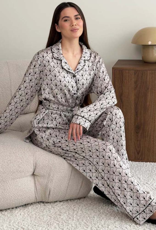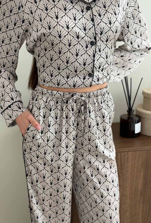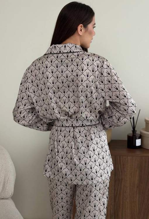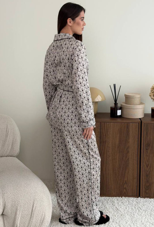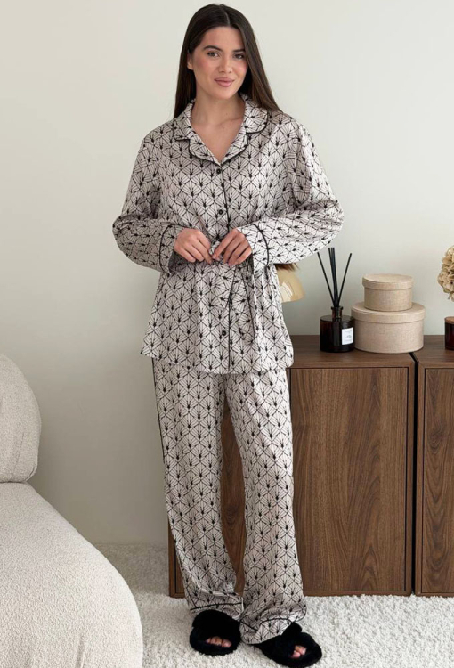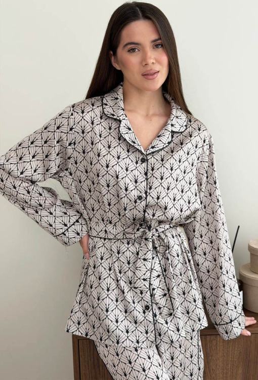 Трендовая женская пижама от украинского бренда V.Velika. Пижама выполнена из качественного и мягкого шелка светло-бежевого цвета с черным принтом в виде орнамента, состоит из рубашки и штанов свободного силуэта. Рубашка с длинными рукавами и отложным воротником, застегивается на пуговицы и завязывается поясом. Воротник, полки, рукава и пояс модели украшены тонким кантом черного цвета, внизу по бокам обработаны небольшие разрезы. Штаны с высокой посадкой, мягкой резинкой в поясе и удобными боковыми карманами, внизу и по бокам оформлены контрастным кантом. Ширина талии регулируется с помощью внутреннего шнурка. Пижама невероятно красивая и комфортная, идеальна как для сна, так и для уютного домашнего отдыха или подарка любиму и близкому человеку.