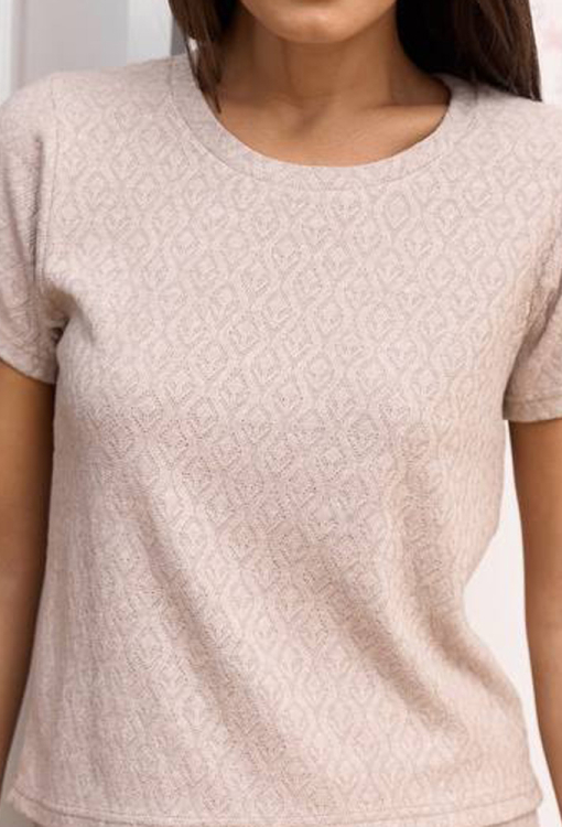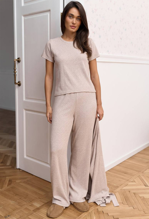 Комфортная женская пижама от украинского бренда DaLi. Пижама выполнена из качественного и мягкого фактурного трикотажа "Ажур" бежевого цвета, состоит из футболки и штанов. Футболка прямого силуэта, с короткими рукавами и круглым вырезом горла штаны также прямого кроя с удобной посадкой и мягкой резинкой в поясе. Пижама очень красивая и удобная, также может быть удобной одеждой для дома и замечательным подарком любимому и близкому человеку.