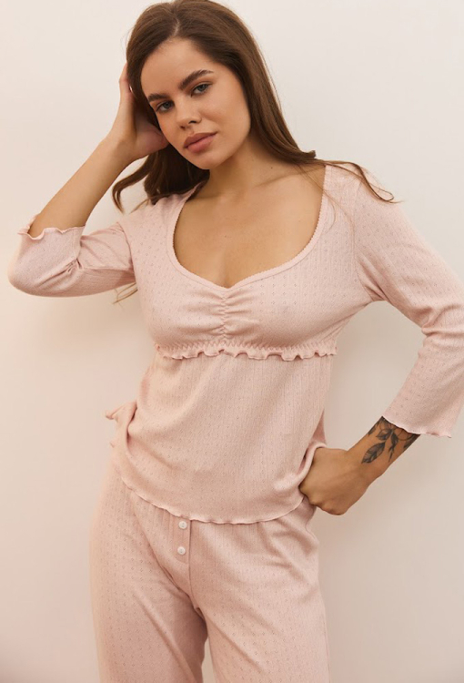 Очаровательная женская пижама из коллекции Sandra от украинского бренда Your Touch. Пижама выполнена из мягкого и качественного хлопкового трикотажа с ажурной фактурой розового цвета, состоит из кофты полуприлегающего силуєта и прямых штанов. Кофта с рукавами 3/4 и U-образным вырезом горла, под грудью, внизу и на рукавах украшена волнистым швом. Штаны с удобной посадкой и мягкой резинкой в поясе, спереди обработаны тремя пуговицами, внизу и на поясе - декоративным швом. Пижама очень красивая и комфортная, также может быть удобной одеждой для дома, или замечательным подарком любимому и близкому человеку.