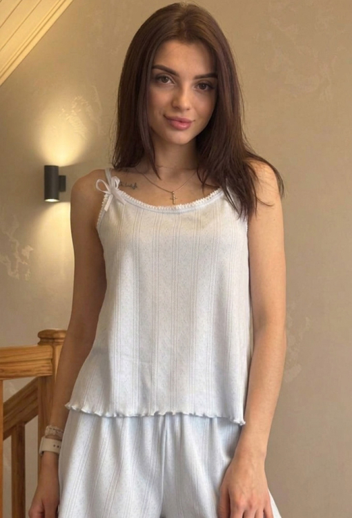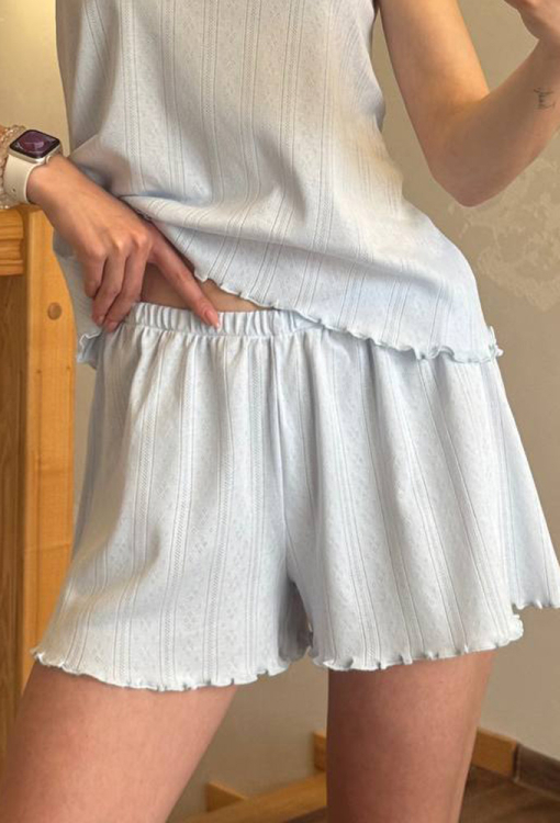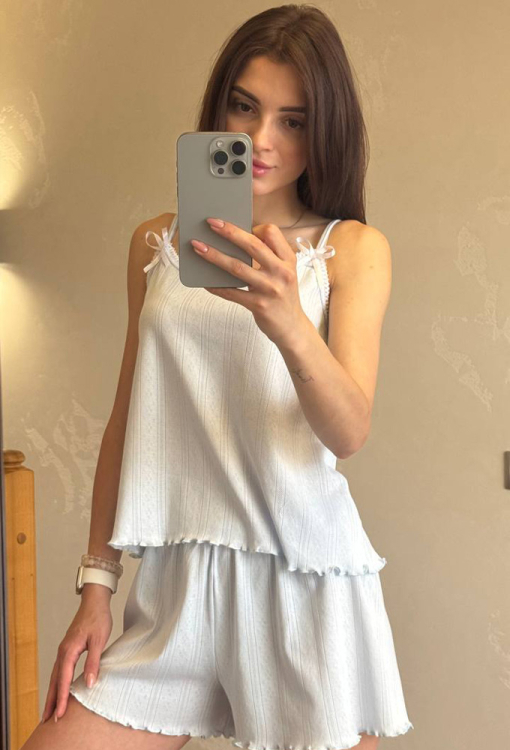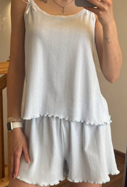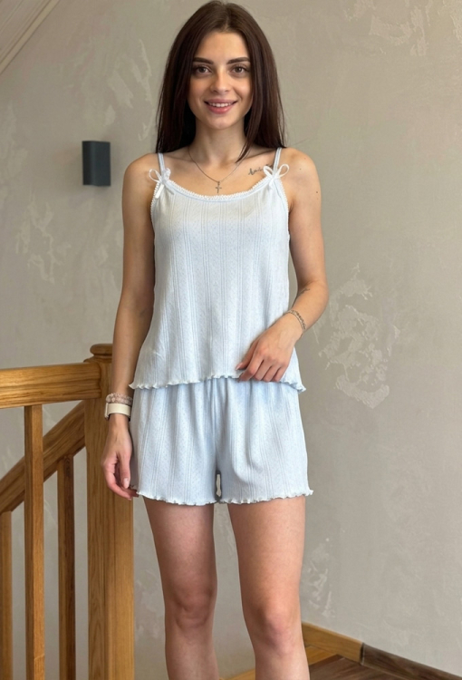Летняя женская пижама от украинского бренда V.Velika. Пижама выполнена из качественного и мягкого трикотажа с красивой узорчатой фактурой голубого цвета, состоит из майки и шорт свободного силуэта. Майка с тонкими бретелями и круглым декольте, бретели модели украшены атласными бантиками, линия выреза - тонким белым кружевом, низ обработан декоративным швом. Шорты с удобной посадкой и мягкой резинкой в поясе, внизу украшены волнистой отделкой. Пижама невероятно красивая и комфортная, идеальна как для сна, так и для уютного домашнего отдыха жарким летом, также может быть замечательным подарком любиму и близкому человеку.