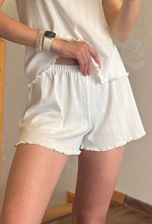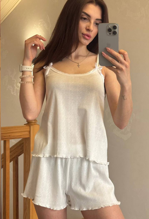 Летняя женская пижама от украинского бренда V.Velika. Пижама выполнена из качественного и мягкого трикотажа, молочного цвета с красивой узорчатой фактурой, состоит из майки и шорт свободного силуэта. Майка с тонкими бретелями и круглым декольте, бретели модели украшены атласными бантиками, линия выреза - тонким кружевом, низ обработан декоративным швом. Шорты с удобной посадкой и мягкой резинкой в поясе, внизу украшены волнистой отделкой. Пижама невероятно красивая и комфортная, идеальна как для сна, так и для уютного домашнего отдыха жарким летом, также может быть замечательным подарком любиму и близкому человеку.