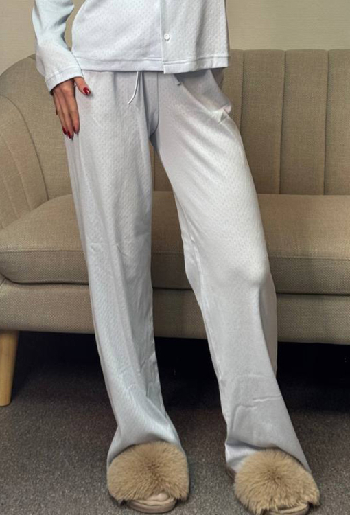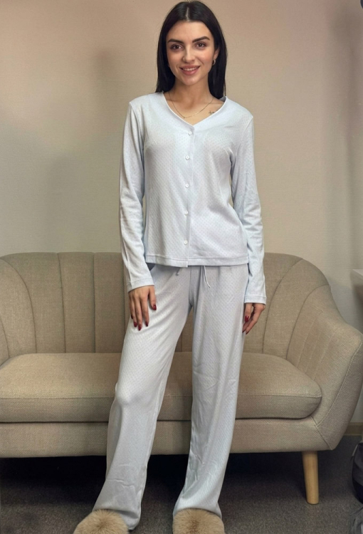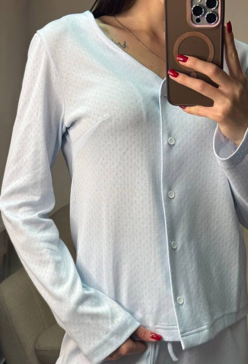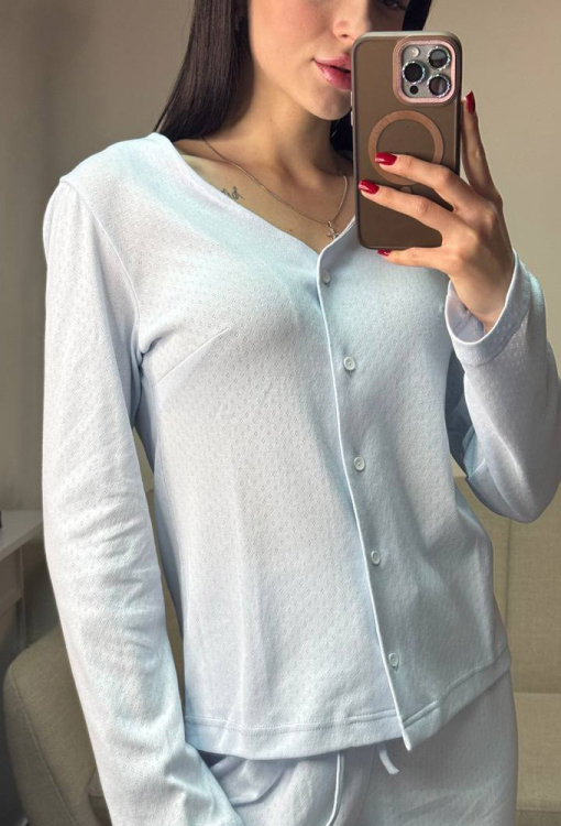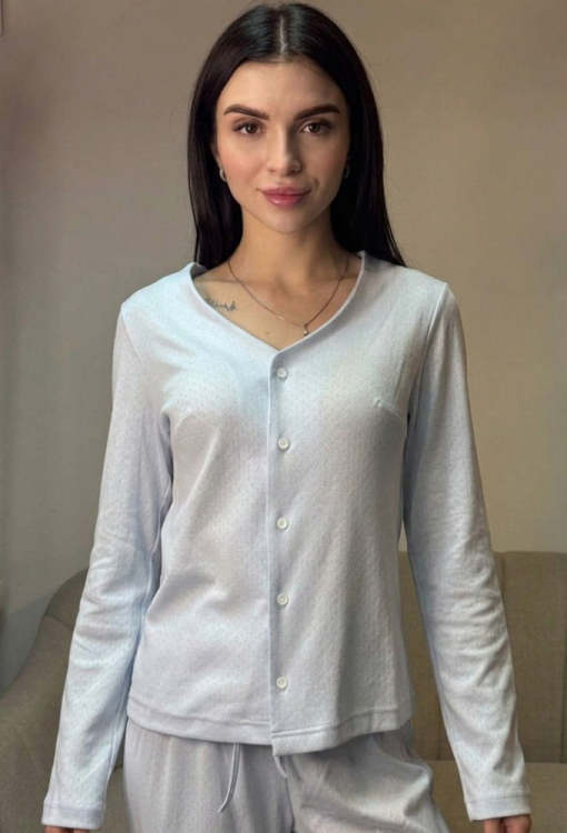 Нежная женская пижама от украинского бренда V.Velika. Пижама выполнена из качественного и мягкого трикотажа, голубого цвета с ажурной фактурой в виде маленьких ромбиков, состоит из кофты и штанов свободного силуэта. Кофта с длинными рукавами и V-образным вырезом горла, застегивается на пуговицы. Штаны с высокой посадкой и мягкой резинкой в поясе, регулируются по ширине с помощью внутреннего шнурка. Пижама невероятно красивая и комфортная, идеальна как для сна, так и для уютного домашнего отдыха или подарка любиму и близкому человеку.