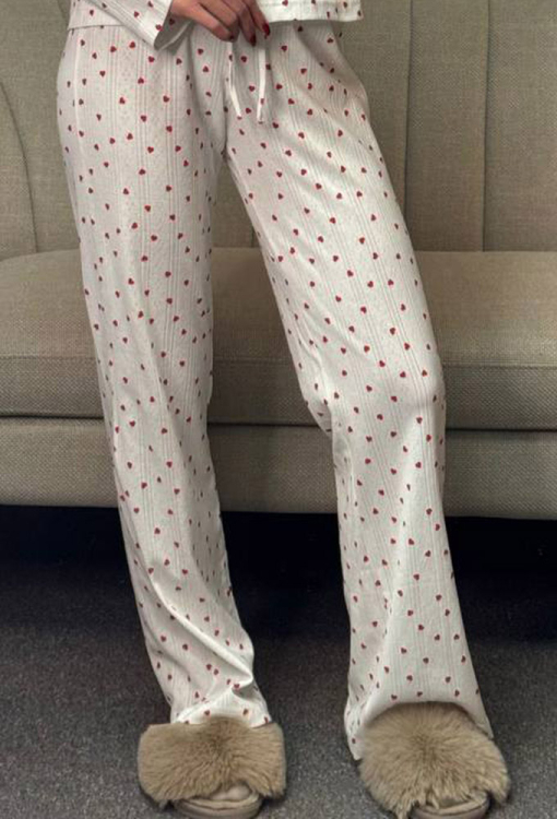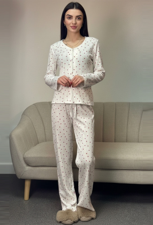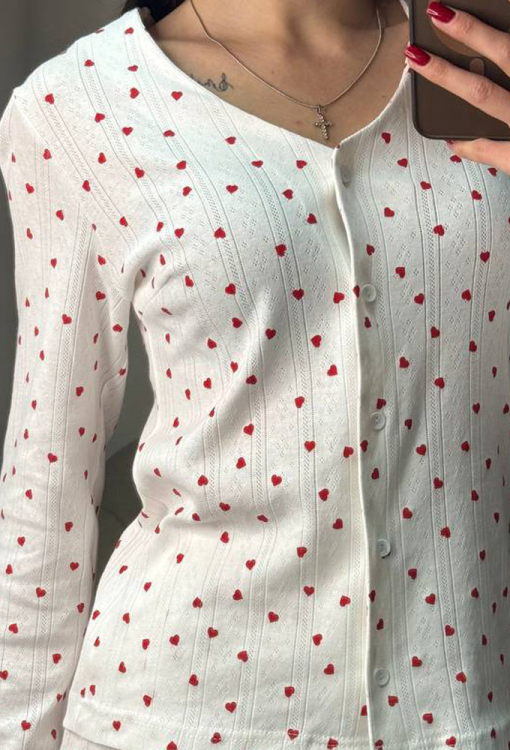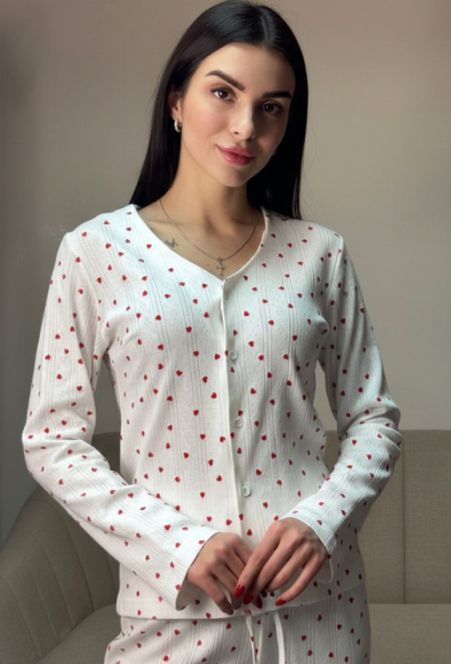 Романтичная женская пижама от украинского бренда V.Velika. Пижама выполнена из качественного и мягкого трикотажа с нежной узорчатой фактурой, белого цвета с принтом из мелких красных сердечек, состоит из кофты и штанов свободного силуэта. Кофта с длинными рукавами и V-образным вырезом горла, застегивается на пуговицы. Штаны с высокой посадкой и мягкой резинкой в поясе, регулируются по ширине с помощью внутреннего шнурка. Пижама невероятно красивая и комфортная, идеальна как для сна, так и для уютного домашнего отдыха или подарка любиму и близкому человеку.