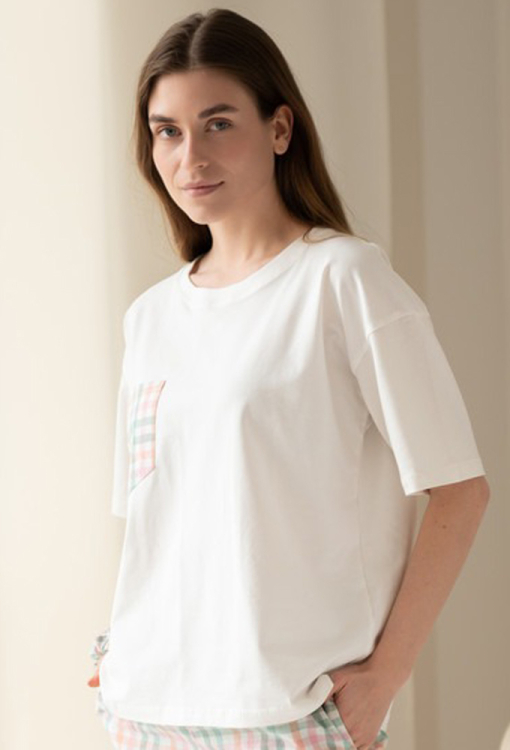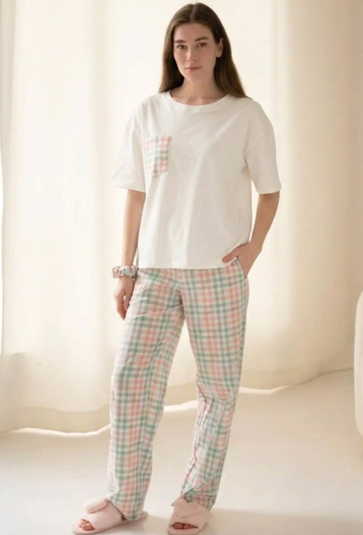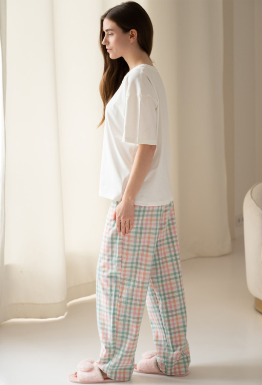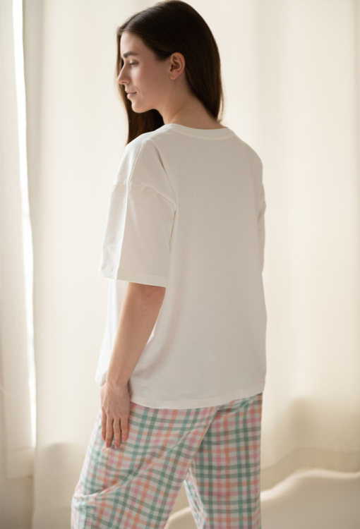 Удобная женская пижама от украинского бренда LoomLine. Пижама выполнена из качественного и мягкого материала, состоит из трикотажной футболки белого цвета, свободного силуэта и широких штанов из вареного хлопка в клетчатый принт разных цветов. Футболка с короткими рукавами, заниженным плечевым швом и круглым вырезом горла, украшена нагрудным карманчиком в тон штанов. Штаны с мягкой резинкой в поясе и удобными боковыми карманами. Пижама красивая и очень комфортная, идеальна для сна и домашнего уюта, а также может быть замечательным подарком любимому и близкому человеку.